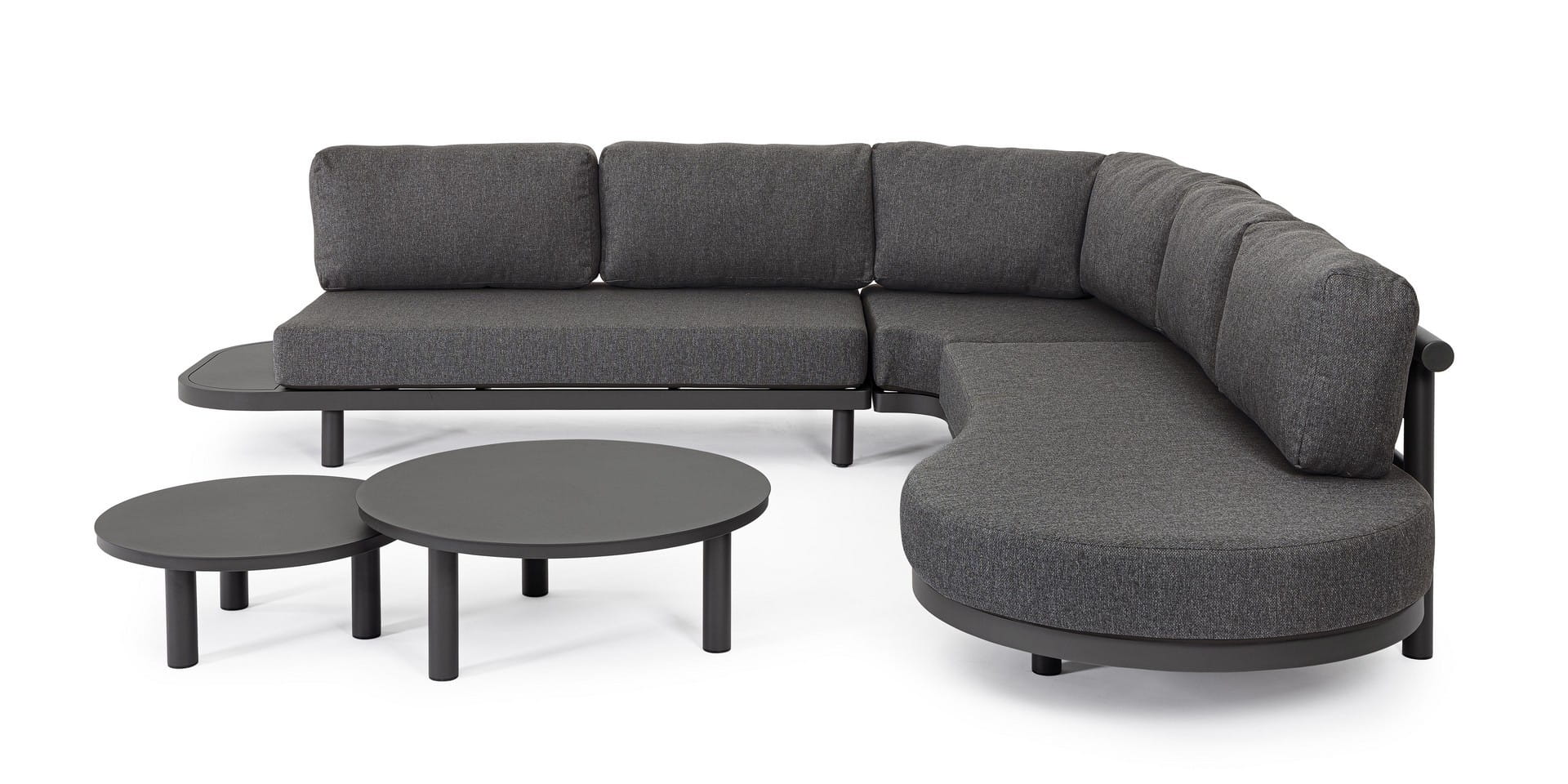 Innowacyjny układ narożnika pozwala na optymalne zagospodarowanie przestrzeni, a subtelnie wyprofilowane kształty mebla dodają całości lekkości. Regulowane nóżki ułatwiają wypoziomowanie zestawu nawet na nierównym podłożu. Dopełnieniem całości są funkcjonalne stoliki kawowe o zaokrąglonych liniach, które podkreślają spójny i nowoczesny charakter kolekcji.