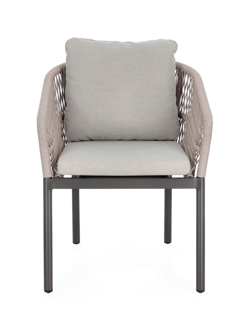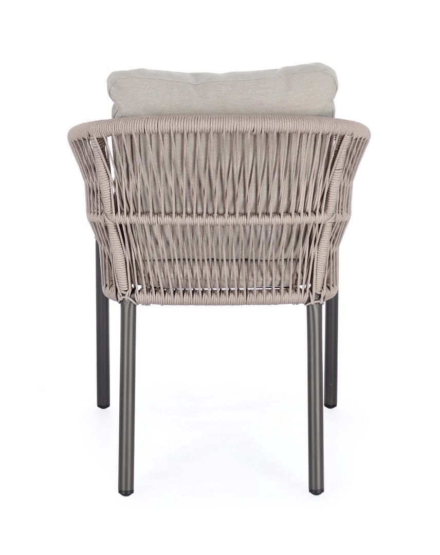 Oparcie i boki wykonane zostały z plecionegio ręcznie poliestrowego sznura o dekoracyjnym splocie. Tworzą efektowną strukturę, która nadaje krzesłu unikalnego charakteru, a jednocześnie zapewnia komfortowe podparcie. Wodoodporne poduszki na siedzisku i oparciu, wykonane z poliestru odpornego na wilgoć i zabrudzenia, posiadają zdejmowane pokrowce, co ułatwia ich czyszczenie i codzienne użytkowanie.