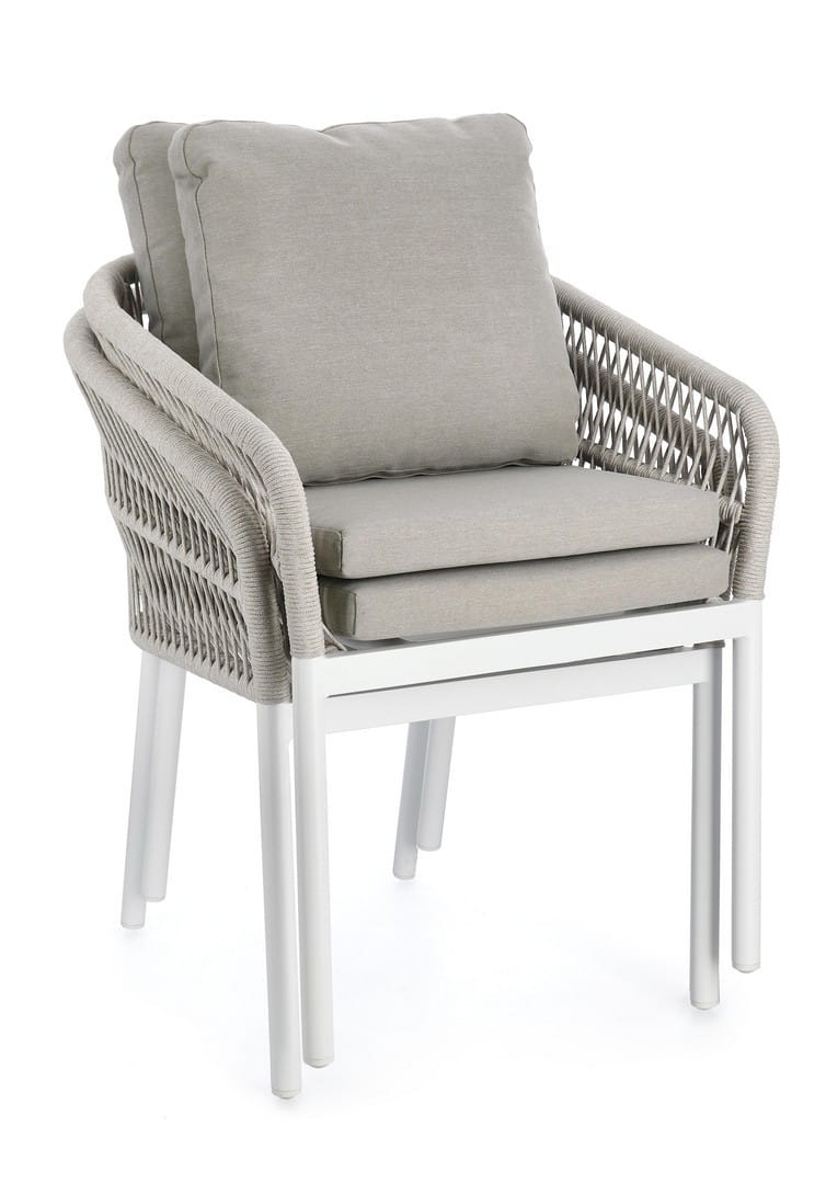 Oparcie i boki wykonane zostały z plecionegio ręcznie poliestrowego sznura o dekoracyjnym splocie. Tworzą efektowną strukturę, która nadaje krzesłu unikalnego charakteru, a jednocześnie zapewnia komfortowe podparcie. Wodoodporne poduszki na siedzisku i oparciu, wykonane z poliestru odpornego na wilgoć i zabrudzenia, posiadają zdejmowane pokrowce, co ułatwia ich czyszczenie i codzienne użytkowanie.
