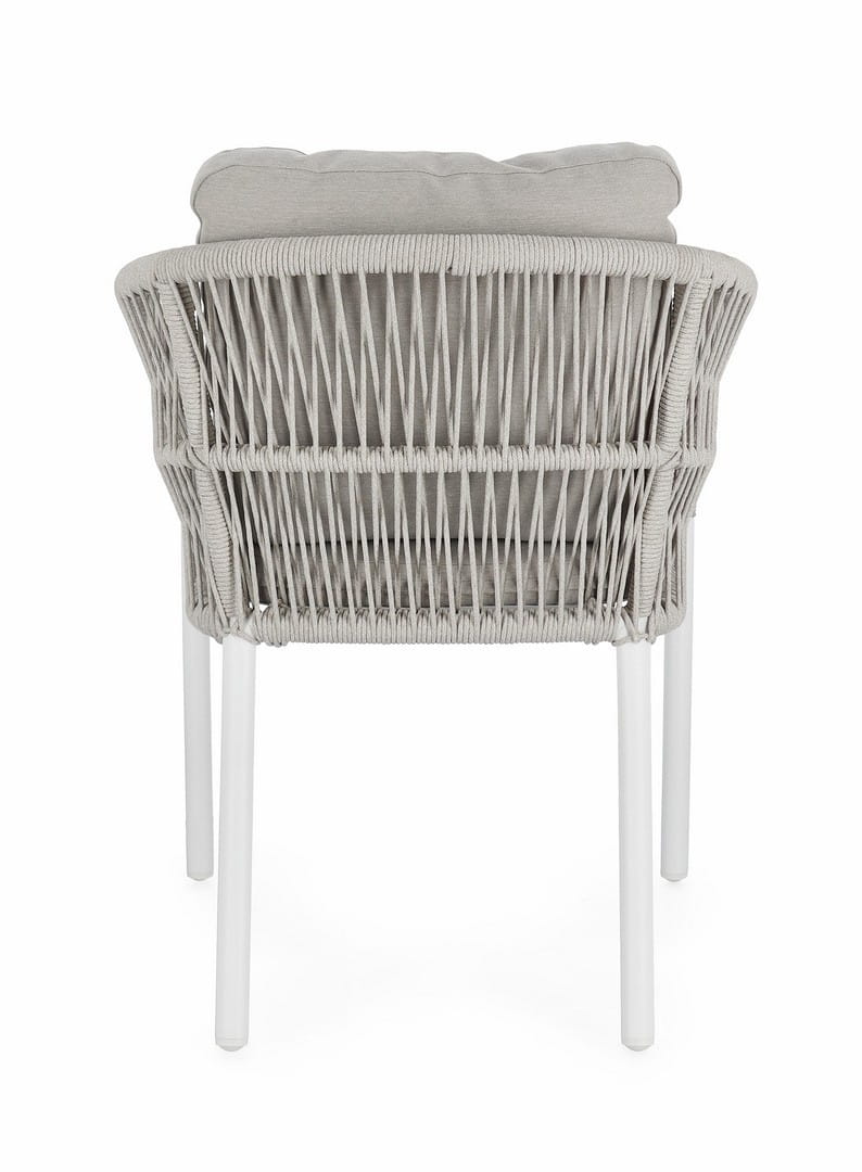 Oparcie i boki wykonane zostały z plecionegio ręcznie poliestrowego sznura o dekoracyjnym splocie. Tworzą efektowną strukturę, która nadaje krzesłu unikalnego charakteru, a jednocześnie zapewnia komfortowe podparcie. Wodoodporne poduszki na siedzisku i oparciu, wykonane z poliestru odpornego na wilgoć i zabrudzenia, posiadają zdejmowane pokrowce, co ułatwia ich czyszczenie i codzienne użytkowanie.