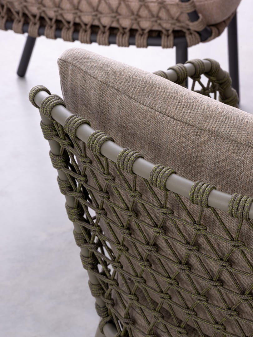 Ivissa przyciąga wzrok ażurowymi bokami wykonanymi z ręcznie plecionej liny polipropylenowej, odpornej na warunki atmosferyczne. Jego lekka, ale solidna konstrukcja ze stali nierdzewnej (typ 201) gwarantuje stabilność i odporność na korozję, nawet przy intensywnym użytkowaniu na zewnątrz.