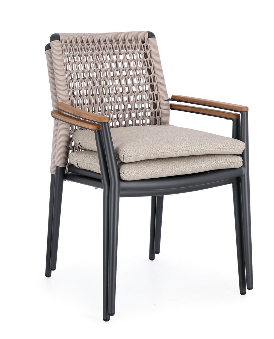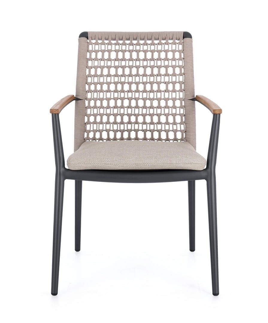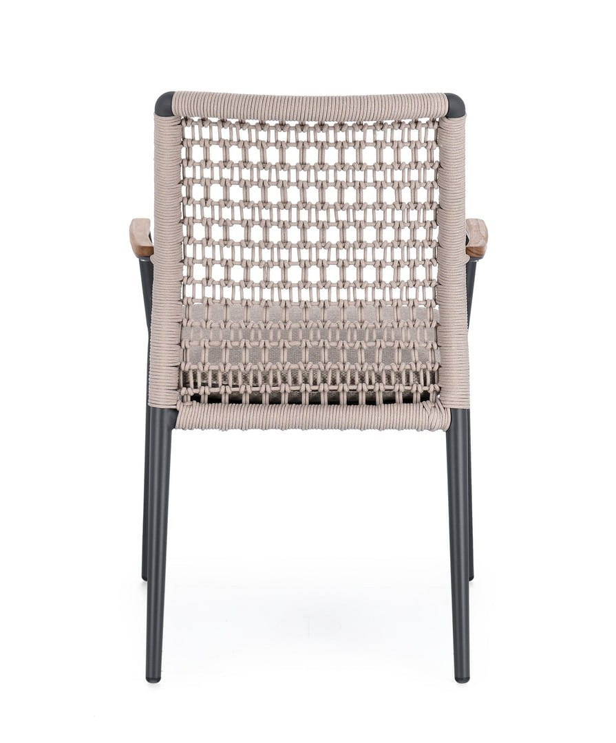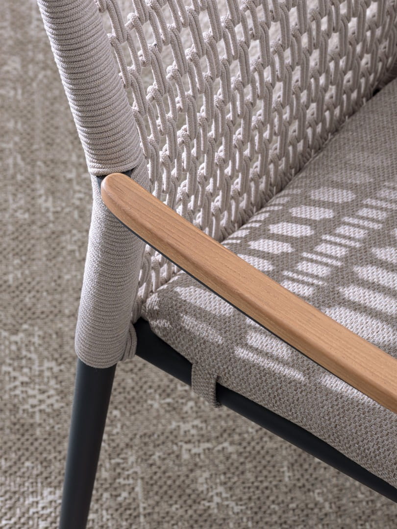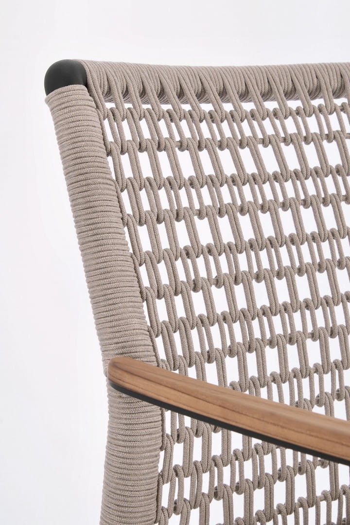 Solidna konstrukcja wykonana z aluminium malowanego proszkowo (poliester) zapewnia trwałość i odporność na warunki atmosferyczne, przy jednoczesnym zachowaniu lekkości. Oparcie i boki krzesła zostały misternie oplecione liną Olefin wykonana z tworzywa sztucznego, tworząc dekoracyjny, a zarazem przewiewny efekt, który podkreśla jego outdoorowy charakter.