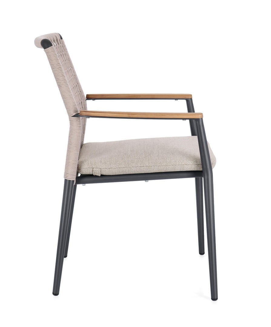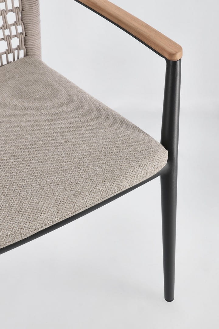 Podłokietniki z drewnianymi wstawkami z drewna tekowego dodają elegancji i ciepła wizualnego, idealnie komponując się z tkaniną i aluminiową ramą. W zestawie znajduje się również zdejmowana poduszka na siedzisko, wykonana z wodoodpornej tkaniny Olefin (100% polipropylen), która zapewnia wygodę i łatwość utrzymania w czystości.