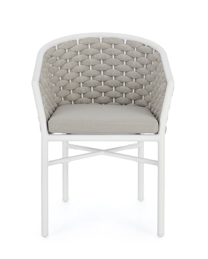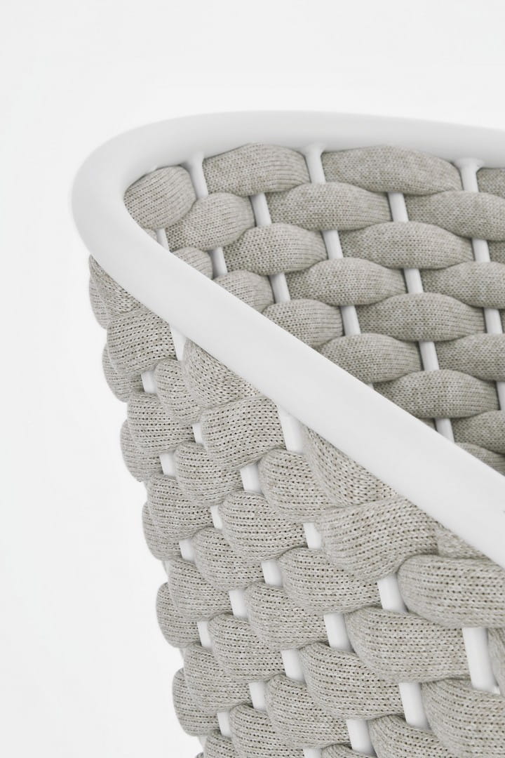 Lekka, a zarazem wytrzymała konstrukcja wykonana została z aluminium malowanego proszkowo (poliester), odpornego na korozję i zmienne warunki atmosferyczne. Efektowne oparcie i boki oplecione są liną z poliestru z gumowym wypełnieniem (polietylen), tworząc wyrazistą strukturę, która nie tylko przyciąga wzrok, ale zapewnia także sprężyste podparcie dla pleców.