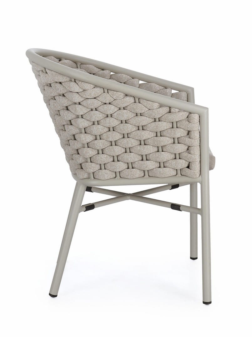 Lekka, a zarazem wytrzymała konstrukcja wykonana została z aluminium malowanego proszkowo (poliester), odpornego na korozję i zmienne warunki atmosferyczne. Efektowne oparcie i boki oplecione są liną z poliestru z gumowym wypełnieniem (polietylen), tworząc wyrazistą strukturę, która nie tylko przyciąga wzrok, ale zapewnia także sprężyste podparcie dla pleców.