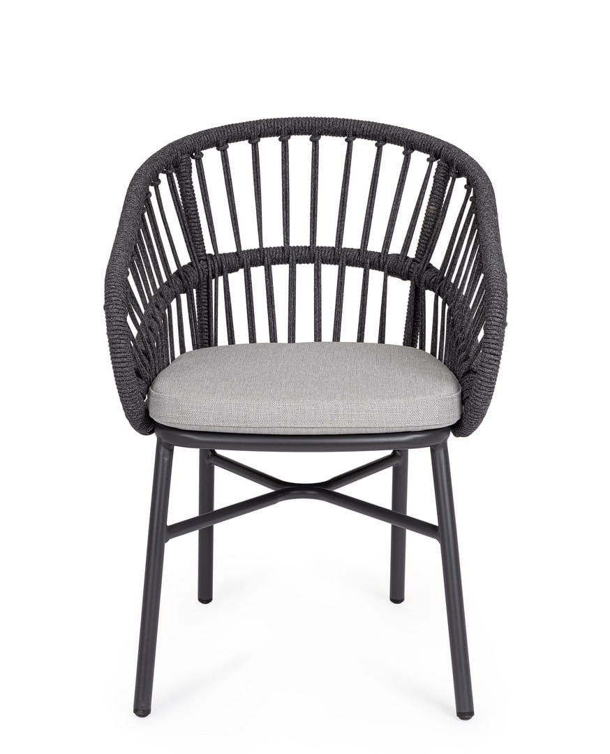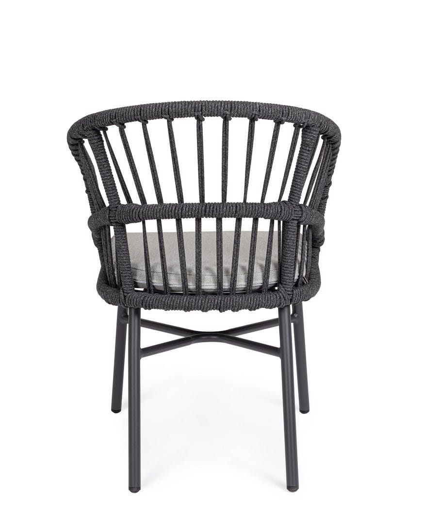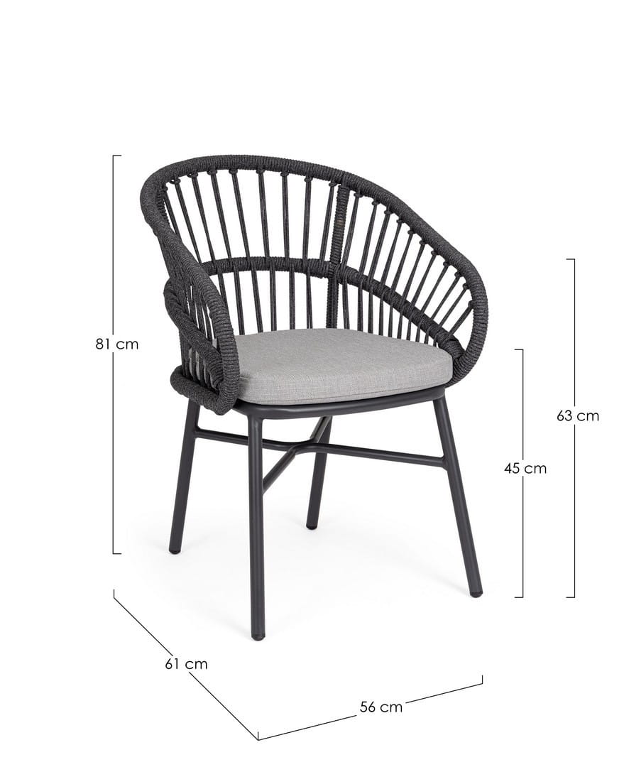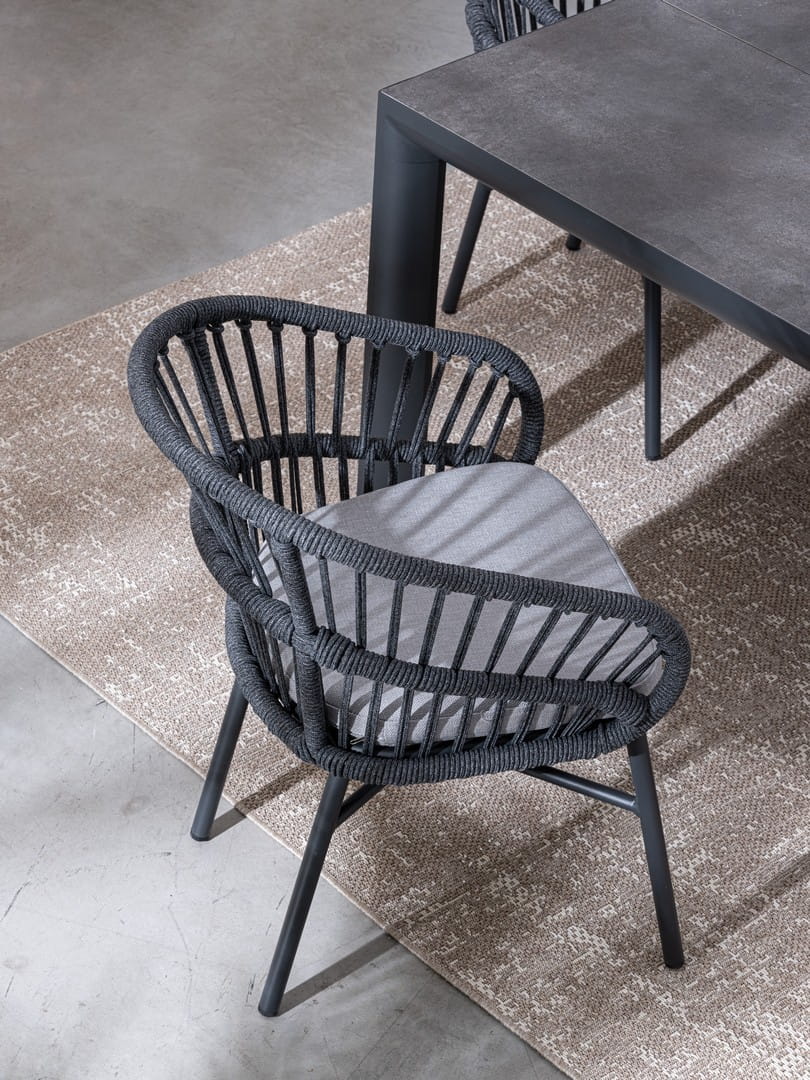 Konstrukcja z aluminium malowanego proszkowo jest trwała, odporna na czynniki atmosferyczne i łatwa w utrzymaniu, a plecionka z poliestrowej liny została zaprojektowana specjalnie z myślą o użytkowaniu na zewnątrz. Zdejmowane poduszki w tkaninie Olefin są wodoodporne i odporne na promienie UV, co zwiększa komfort użytkowania na świeżym powietrzu. Krzesła można sztaplować, co ułatwia przechowywanie, a dostarczane są bez kartonowego opakowania — gotowe do ustawienia od razu po dostawie.