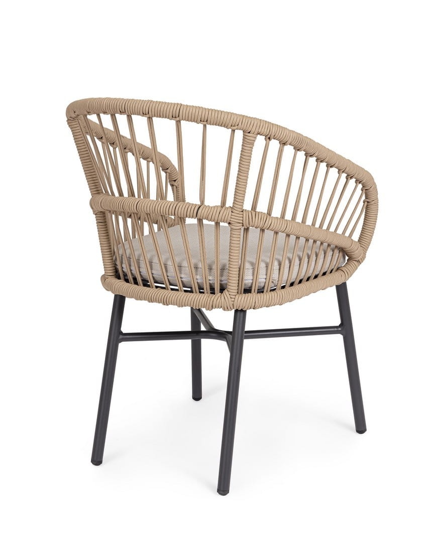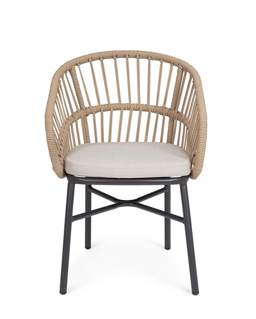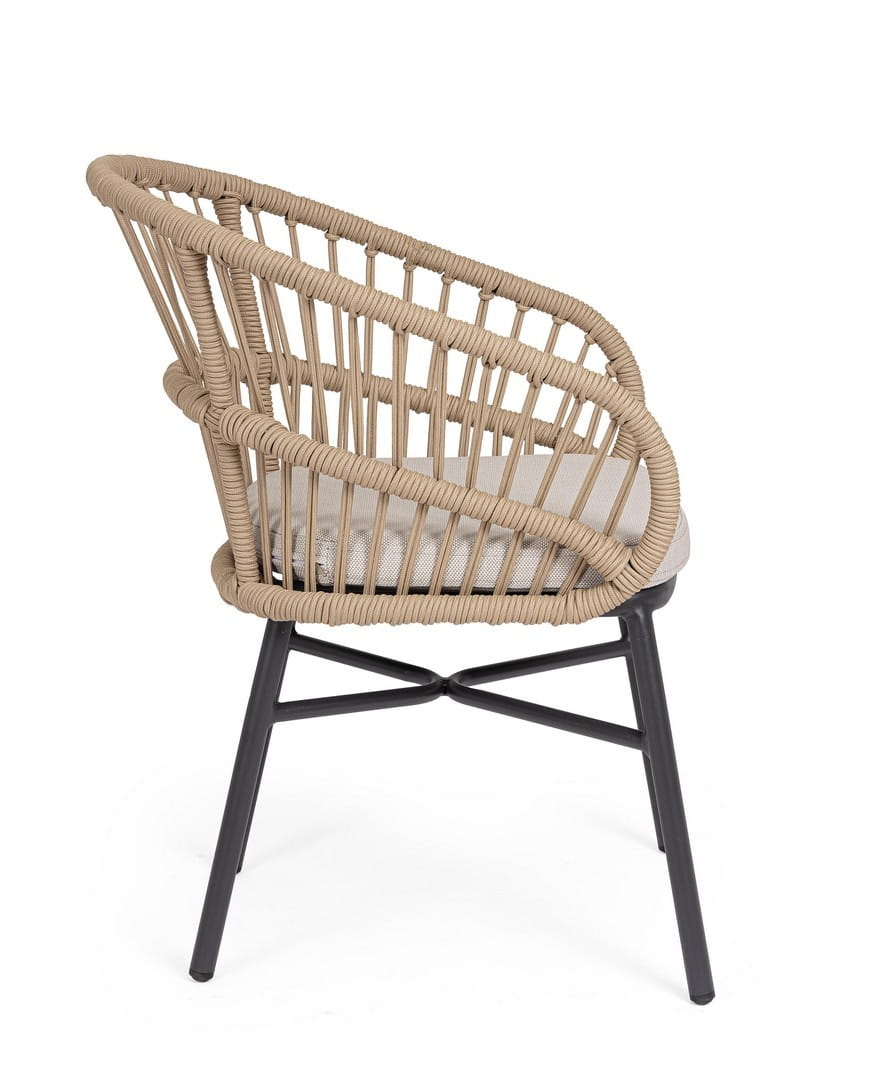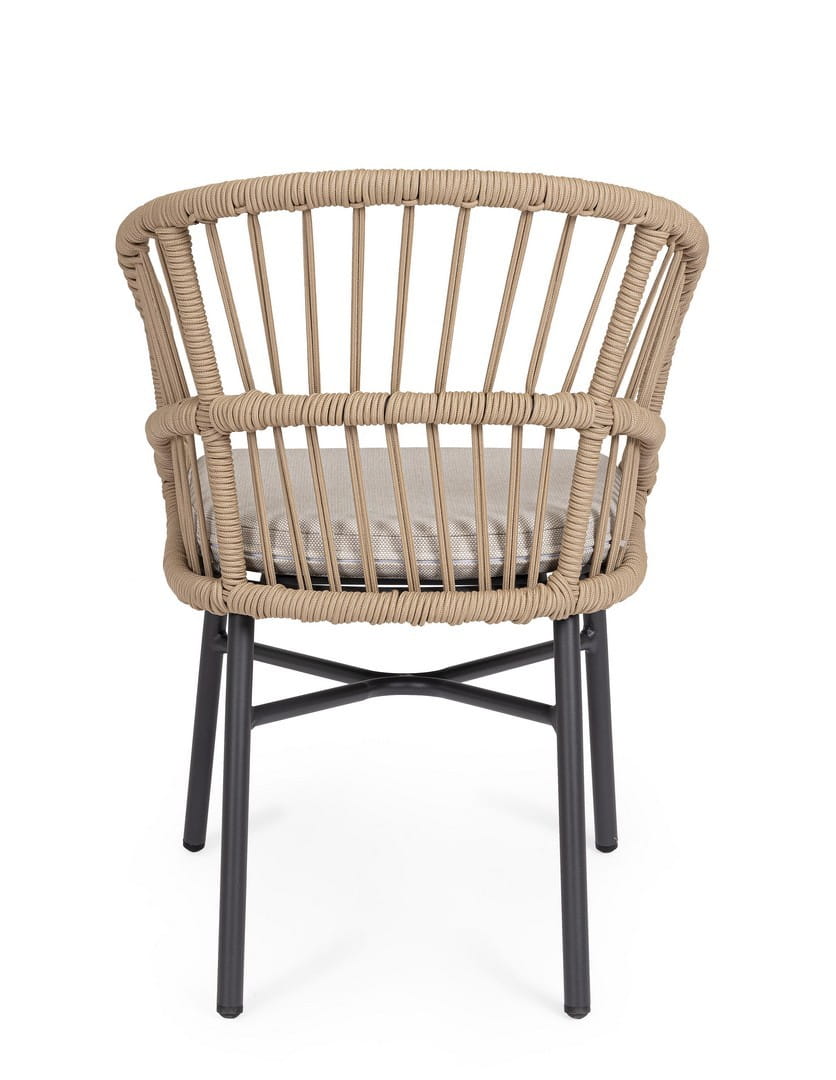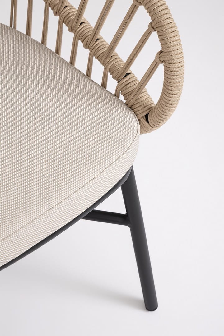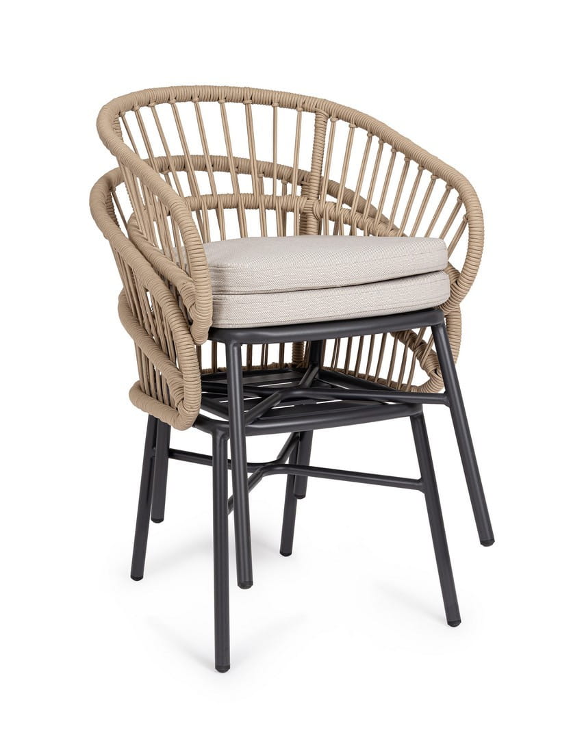 Konstrukcja z aluminium malowanego proszkowo jest trwała, odporna na czynniki atmosferyczne i łatwa w utrzymaniu, a plecionka z poliestrowej liny została zaprojektowana specjalnie z myślą o użytkowaniu na zewnątrz. Zdejmowane poduszki w tkaninie Olefin są wodoodporne i odporne na promienie UV, co zwiększa komfort użytkowania na świeżym powietrzu. Krzesła można sztaplować, co ułatwia przechowywanie, a dostarczane są bez kartonowego opakowania — gotowe do ustawienia od razu po dostawie.