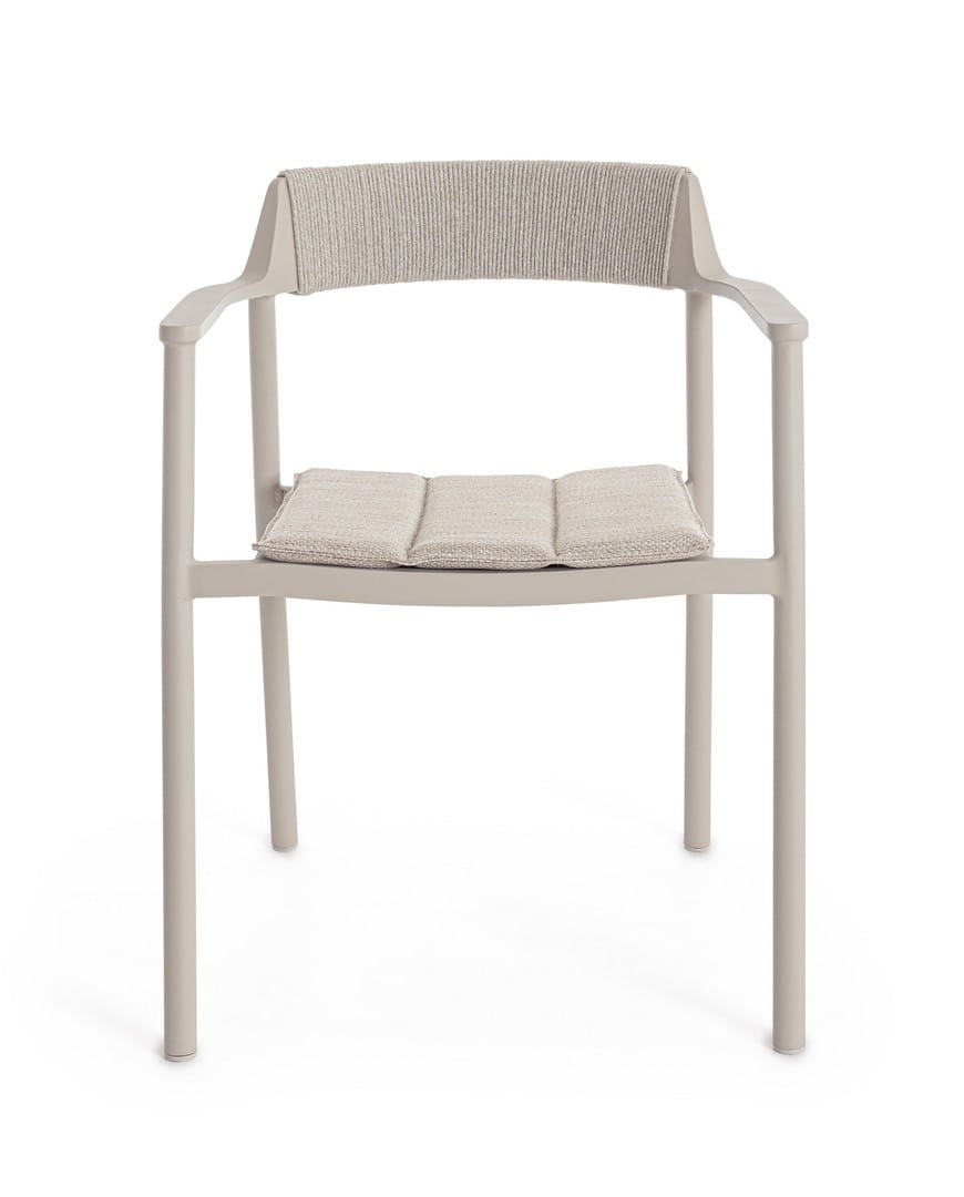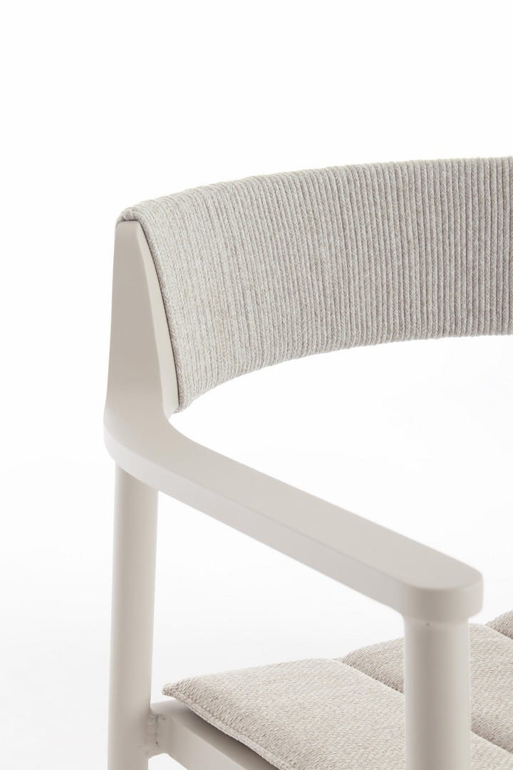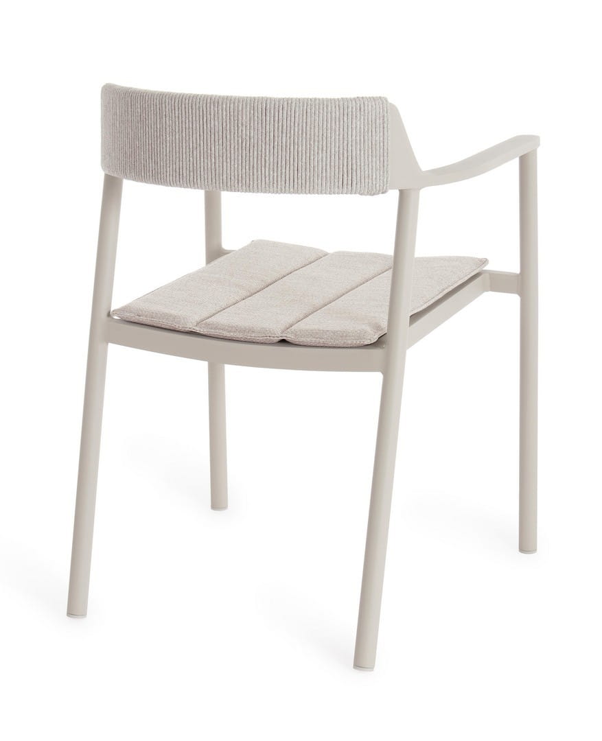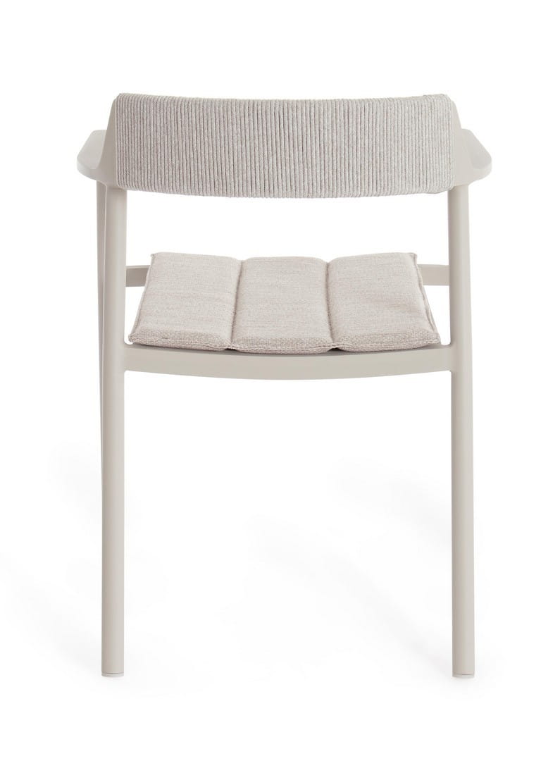 Oparcie krzesła zdobi pleciona tkanina z poliestrowej liny, która nadaje meblowi wyjątkowy charakter oraz zapewnia wygodę podczas użytkowania. Komfort siedzenia podnosi zdejmowana poduszka, pokryta wodoodporną tkaniną olefinową (100% polipropylen), łatwą w czyszczeniu i odporną na działanie wilgoci.