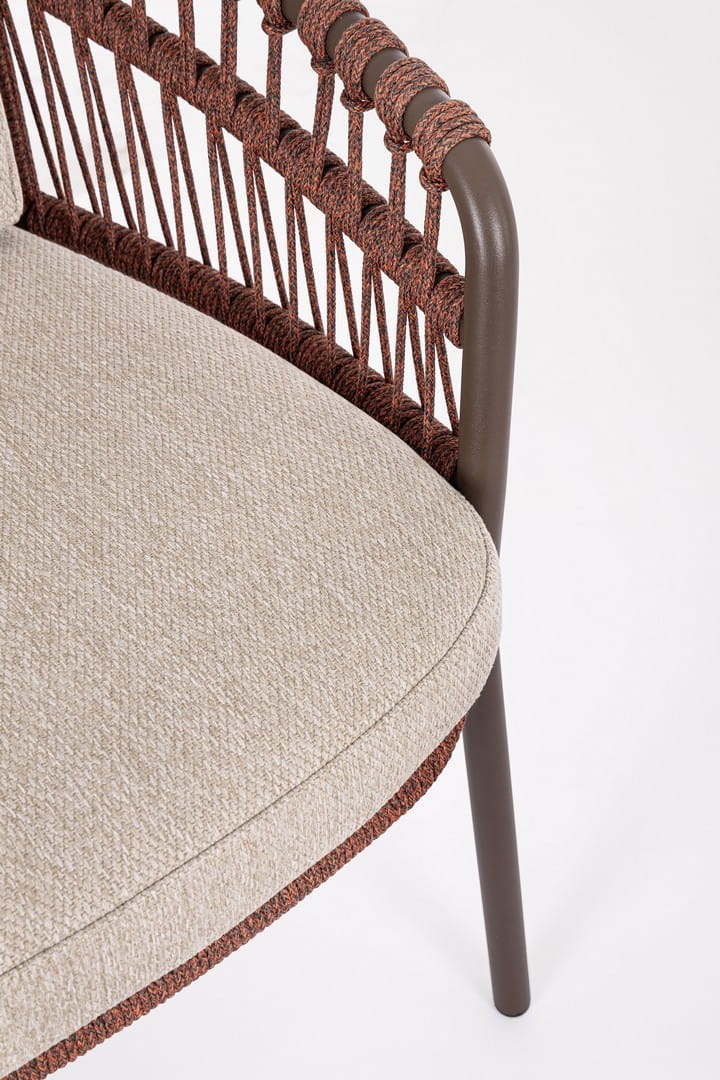 Krzesło ogrodowe Talaia to stylowa propozycja dla osób, które cenią sobie połączenie współczesnego designu z funkcjonalnością dopasowaną do warunków zewnętrznych. Dzięki subtelnym liniom i wyrazistemu splotowi z lin polipropylenowych, mebel ten wnosi do przestrzeni tarasu lub ogrodu lekkość oraz przytulny charakter. Rama wykonana ze stali nierdzewnej zapewnia trwałość i odporność na czynniki atmosferyczne, a wykończenie w dwóch wersjach kolorystycznych – beżowej i ceglastej – pozwala dopasować krzesło do różnych aranżacji.