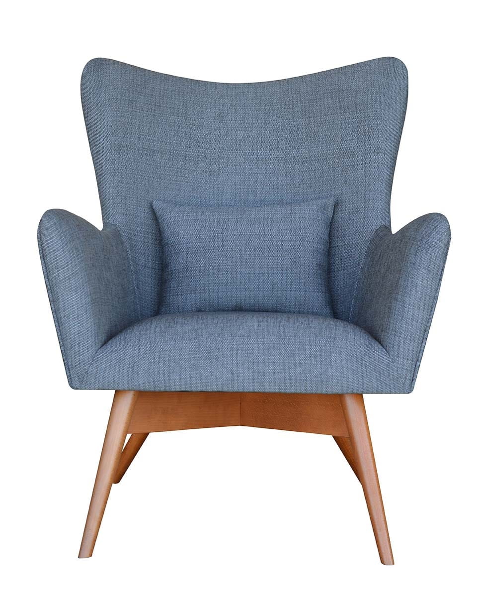 Fotel osadzony jest na drewnianych, lakierowanych nogach, dostępnych w kolorach: orzech oraz jasny naturalny. Dla jeszcze większego komfortu dołączona została poduszka gratis.