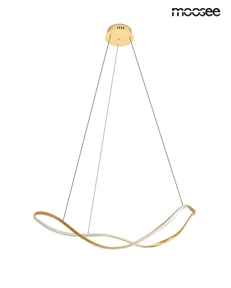 MOOSEE WAVES 80 to nowoczesna lampa wisząca, w której forma inspirowana falami wody spotyka się z eleganckim złotym wykończeniem. Jej dynamiczny, płynny kształt sprawia, że światło zdaje się „tańczyć” w przestrzeni, tworząc subtelny i wyrafinowany efekt wizualny.