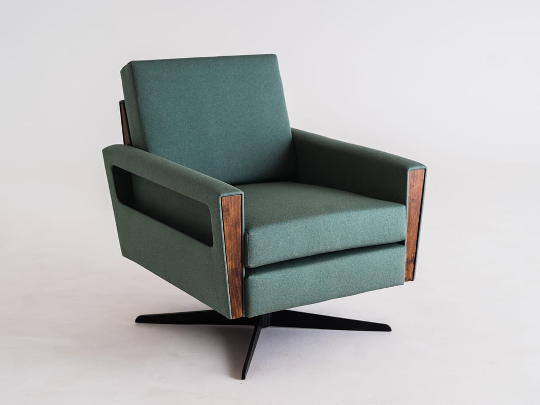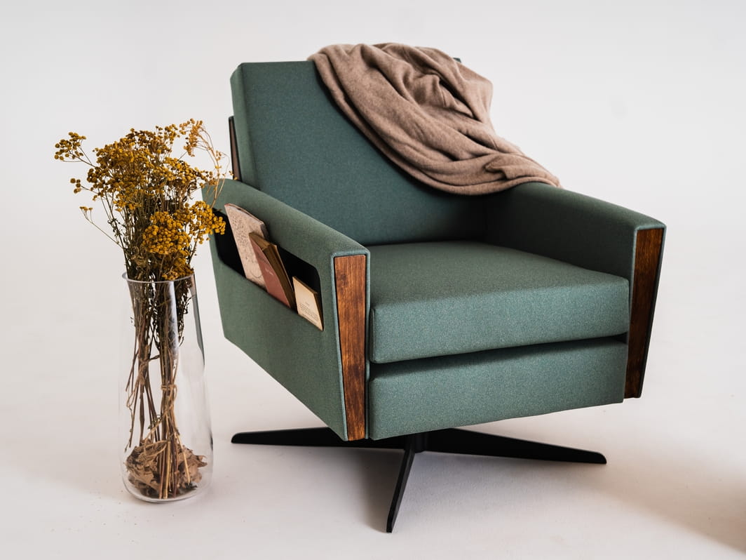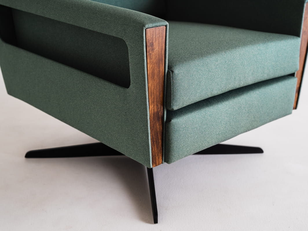 Docent to fotel, który jak najlepsze designerskie meble nie tylko cieszy oko, ale również pozwala odpocząć ciału i duszy. Posiada obrotową podstawę, dzięki czemu, siadając w nim, poczujesz się jak dyrektor w imponującym biurowcu. Szybko jednak zrozumiesz, że docentowi daleko do oficjalności – będziesz pod wrażeniem jego wygody, komfortu, a także miłej w dotyku tkaniny. Takie meble jak fotel Docent mają niepowtarzalny charakter, który kryje się w szczegółach. W jego przypadku są to ozdobne, drewniane elementy na przodzie podłokietników oraz z tyłu oparcia. W podłokietnikach ma również dyskretne kieszonki, które możesz wykorzystać na przechowywanie gazety czy pilota. Nigdzie już nie musisz sięgać, wszystko jest na miejscu! Ręcznie produkowane meble potrafią zachwycać. Imponują one starannością wykonania, solidnością, gwarancją jakości na lata.