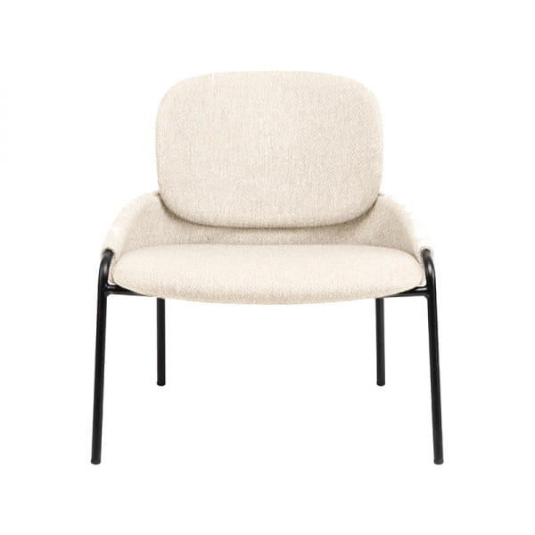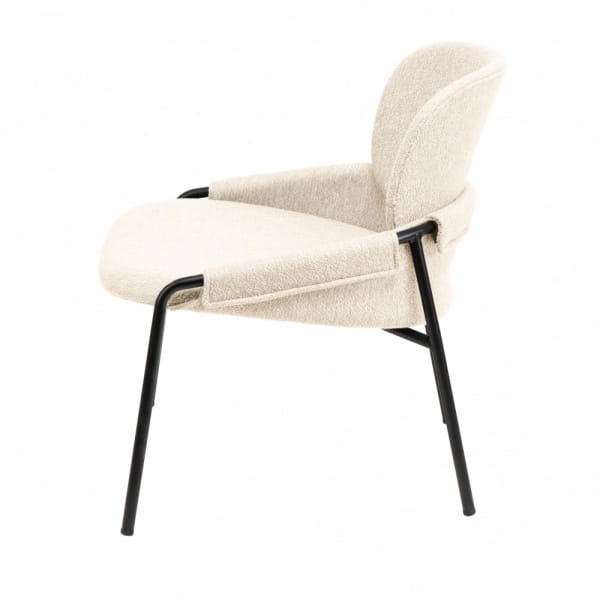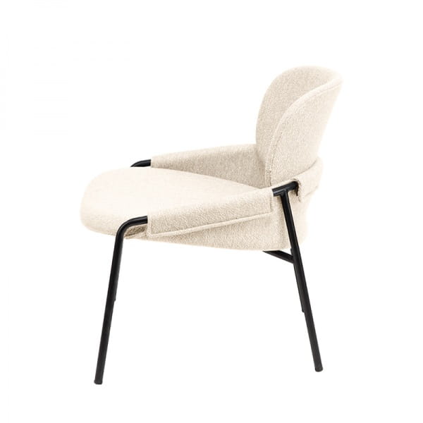 Stelaż wykonany został z wysokiej jakości metalu w kolorze czarnym, dzięki czemu to nie tylko gustowna ozdoba wnętrza, ale także stabilny i wytrzymały mebel. Całość okrywa jasnobeżowa tkanina o wyraźnej strukturze, która podkreśla designerski charakter fotela. Zaokrąglone siedzisko i oparcie zostało wyprofilowane, co wpływa na wysoki komfort podczas codziennego użytkowania. Fotel wyposażony został również w podłokietniki pokryte tkaniną, dzięki czemu wzrasta nie tylko wygoda, ale również odciążenie stawów.