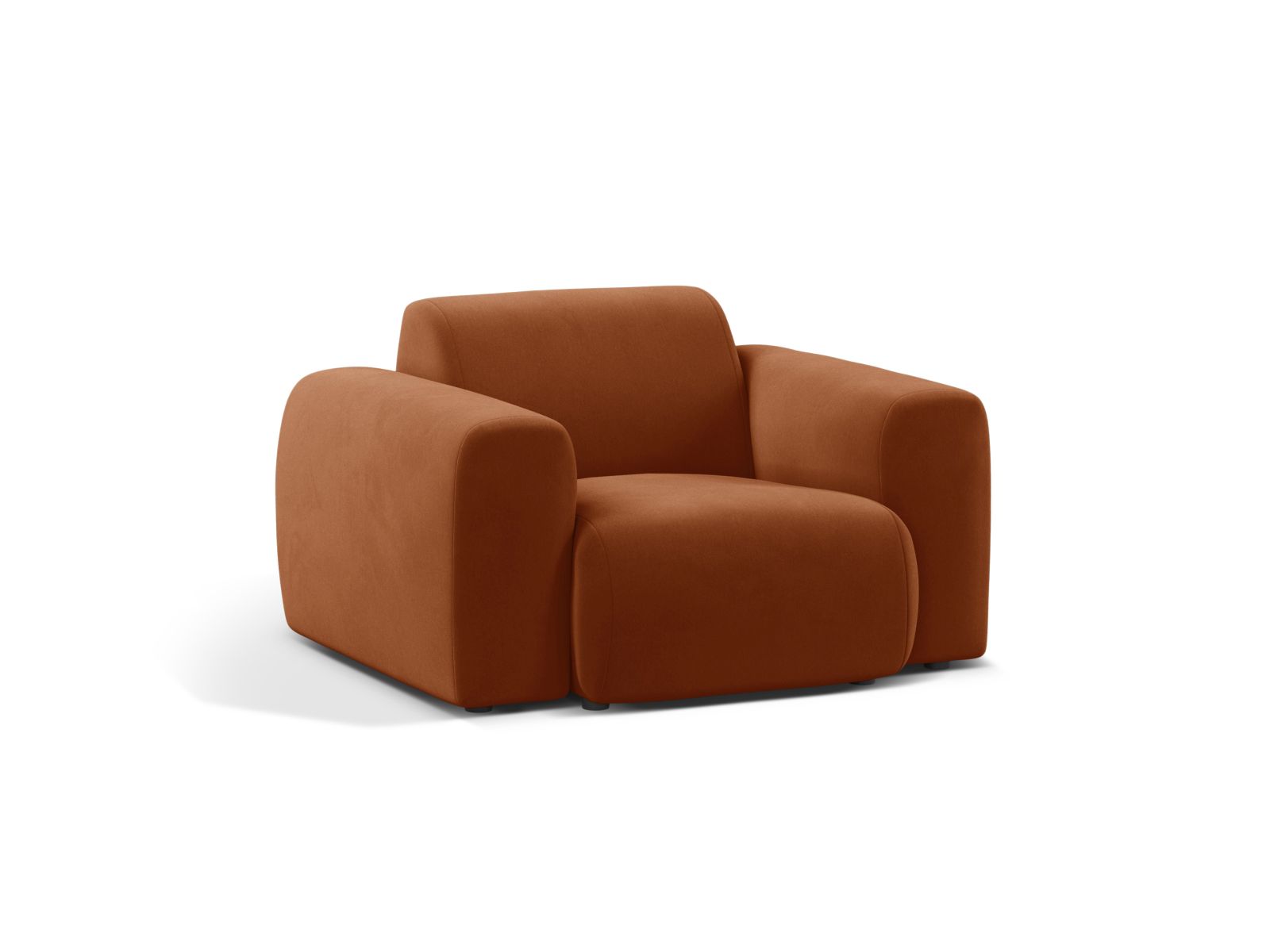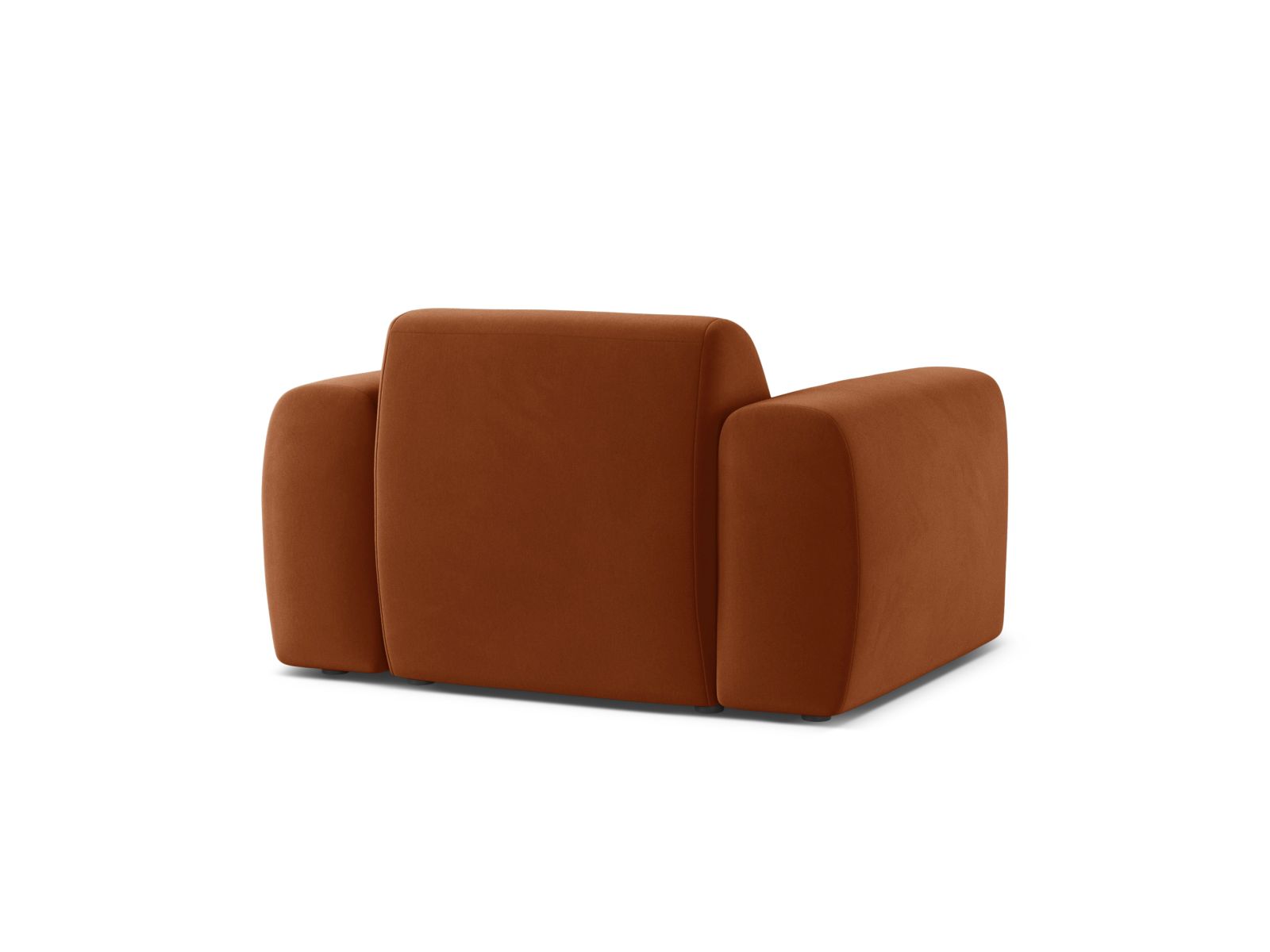 Fotel został obity grubym, przyjemnym w dotyku welurem w niezwykle ciepłym, ceglastym odcieniu terakoty. Zastosowany materiał wyróżnia się eleganckim, delikatnym połyskiem oraz nieprzeciętną funkcjonalnością. Powłoka hydrofobowa sprawia, że ciecze skraplają się na powierzchni, co ułatwia szybkie czyszczenie, a zwiększona odporność na zadrapania czyni ten mebel bezpiecznym wyborem do domów, w których mieszkają zwierzęta. O optymalny komfort dba natomiast wypełnienie ze sprężystej pianki poliuretanowej, która gwarantuje odpowiednie podparcie i niezmienną formę przez lata intensywnego użytkowania.
