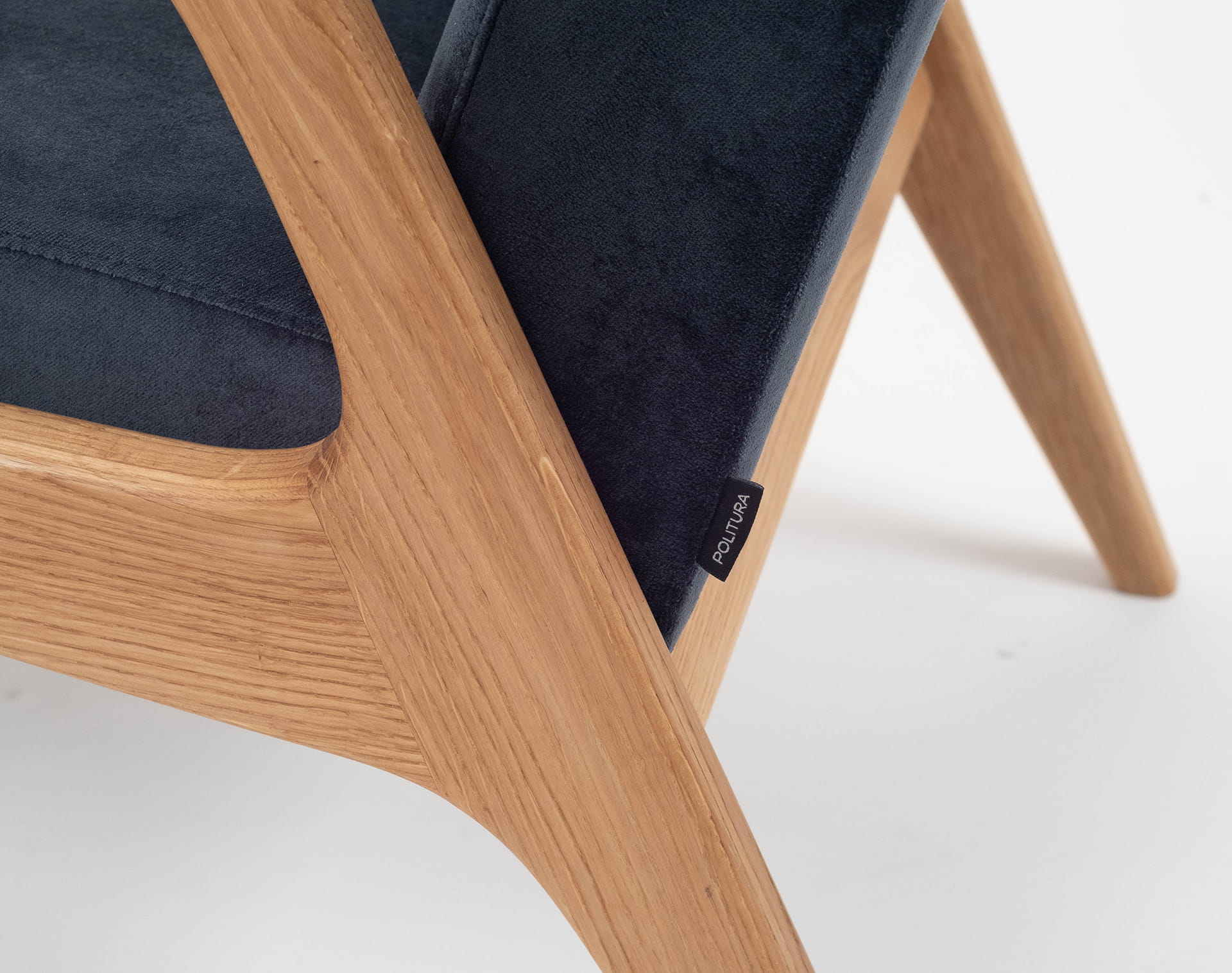 Stelaż z drewna dębowego, wykończony olejem w półmacie - w wersji naturalnej. Tapicerka piankowa umieszczona na konstrukcji z litego drewna.