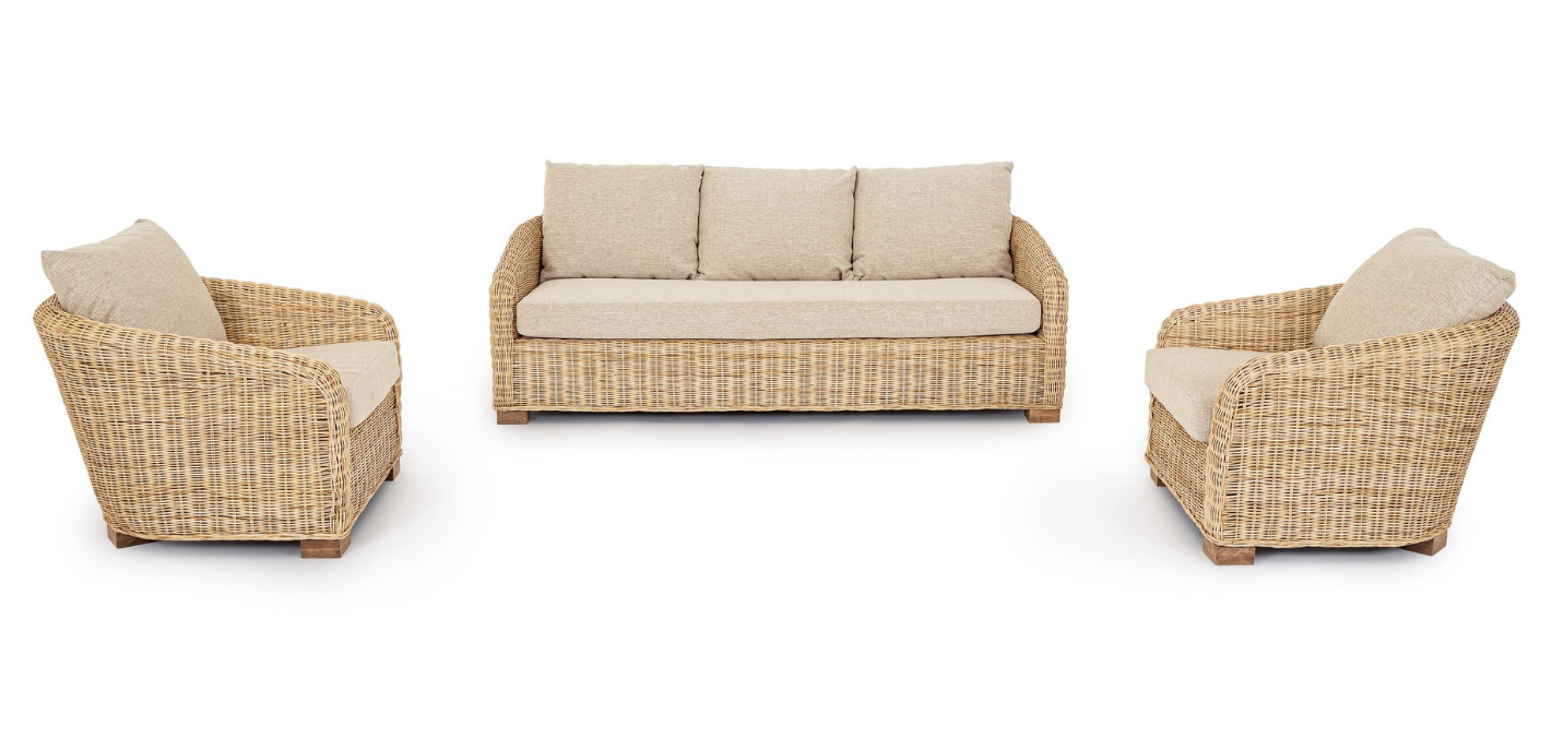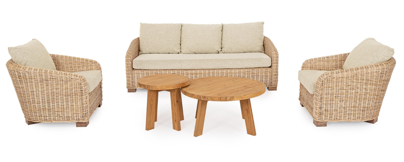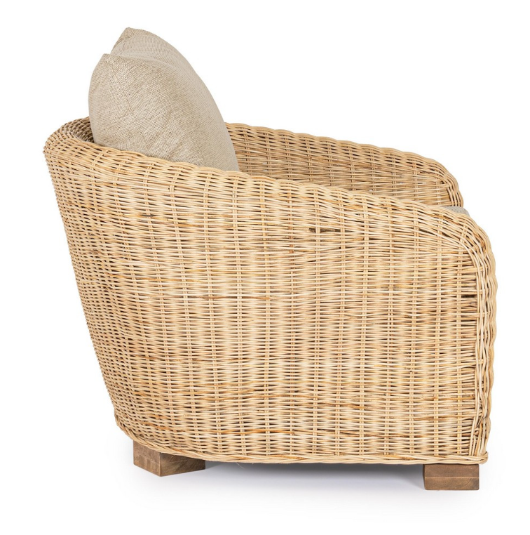 Konstrukcja fotela osadzona jest na solidnych, niskich stopkach wykonanych z egzotycznego drewna mango, co dodaje całości stabilności i elegancji. Komfort użytkowania potęgują obszerne poduchy – zarówno na siedzisku, jak i oparciu. Zastosowane tekstylne wykończenie z poliestru jest wytrzymałe, a dzięki zdejmowanym pokrowcom, utrzymanie ich w czystości jest niezwykle proste.