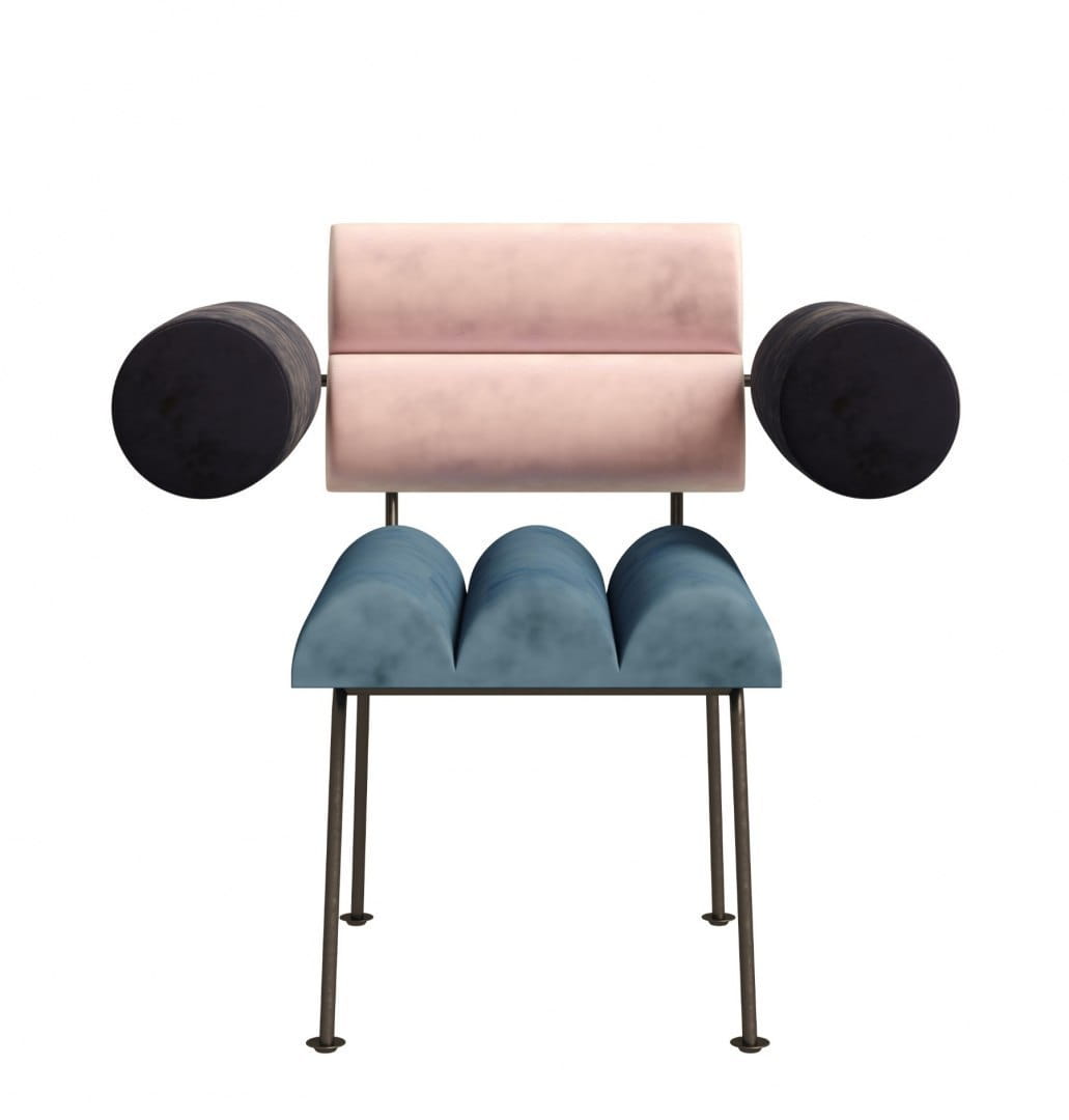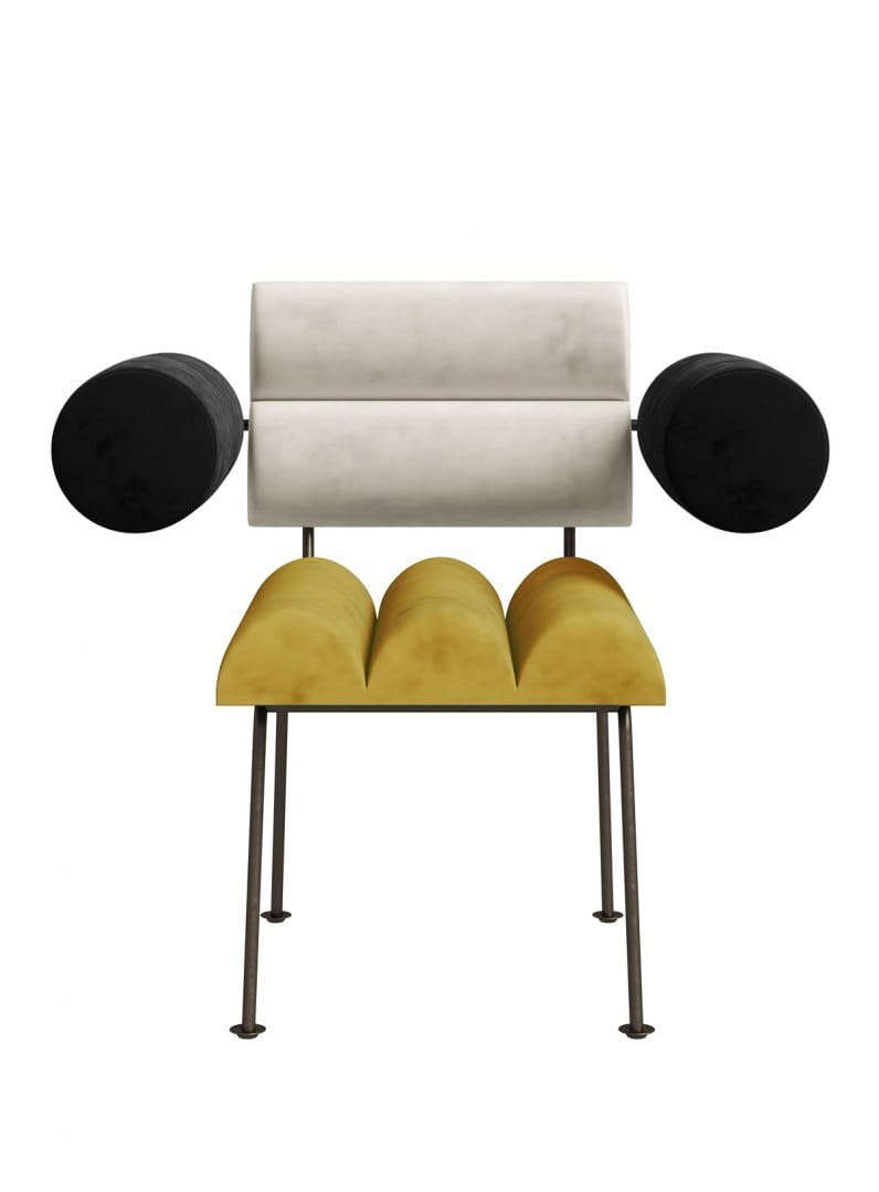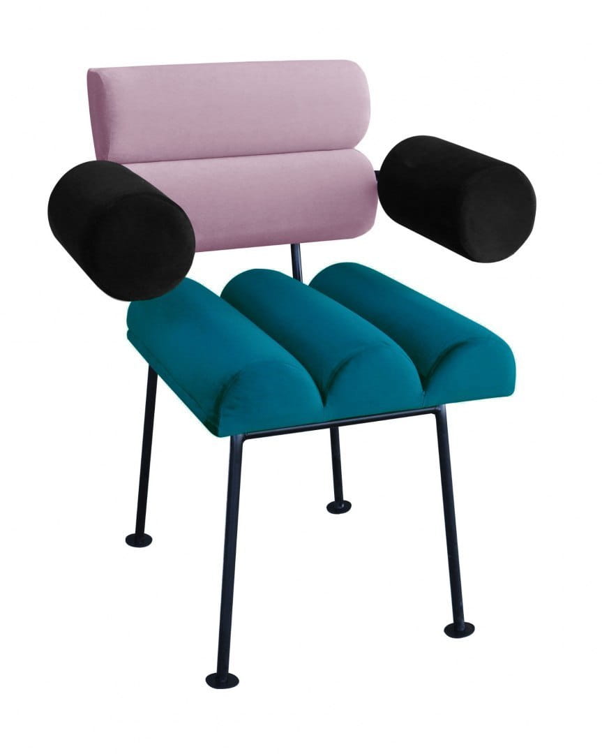 Fotel z podłokietnikami z nowej kolekcji Roll&Roll 2019 zaprojektowanej przez Katarzynę Jasyk. Obicie zostało wykonane z weluru, a siedzisko i oparcie ze sklejki oraz pianki tapicerskiej. Podstawę zrobiono z malowanego proszkowanego czarno metalu.