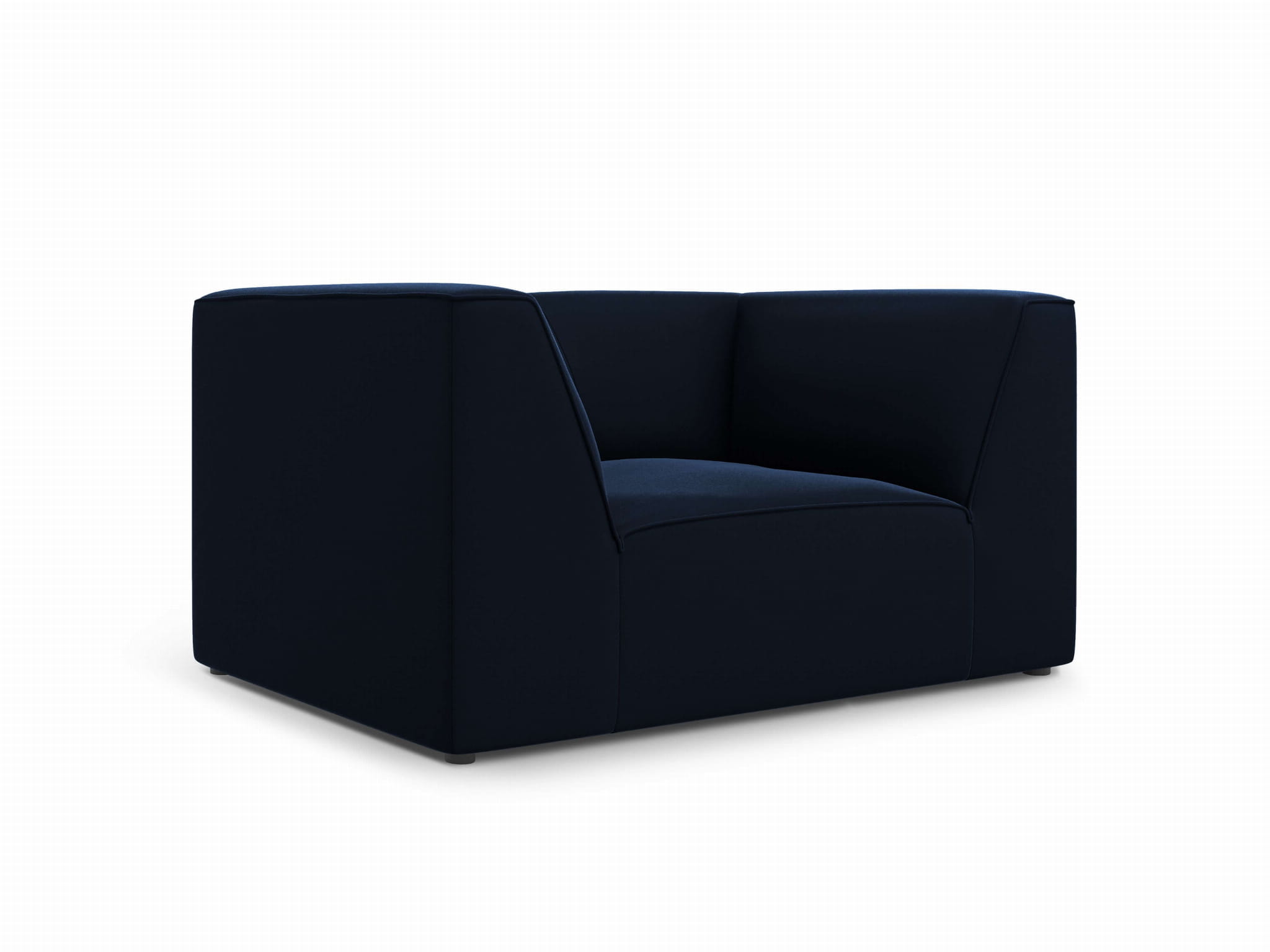 Granatowy, welurowy fotel ustawiony jest na niskich, czarnych nóżkach, dzięki którym bryła mebla delikatnie zdaje się unosić nad powierzchnią.