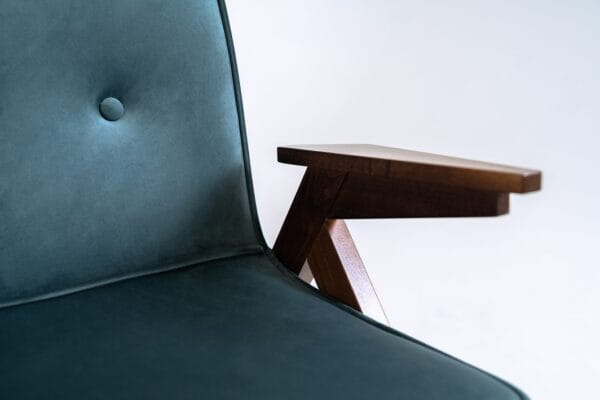 W skład kolekcji wchodzą sofa dwuosobowa, fotel oraz podnóżek, tworząc spójną i elegancką całość. Drewniane elementy wykończenia mogą być wykonane w kolorze naturalnym, orzechu, bieli lub czerni, co pozwala jeszcze lepiej dopasować mebel do charakteru wnętrza.