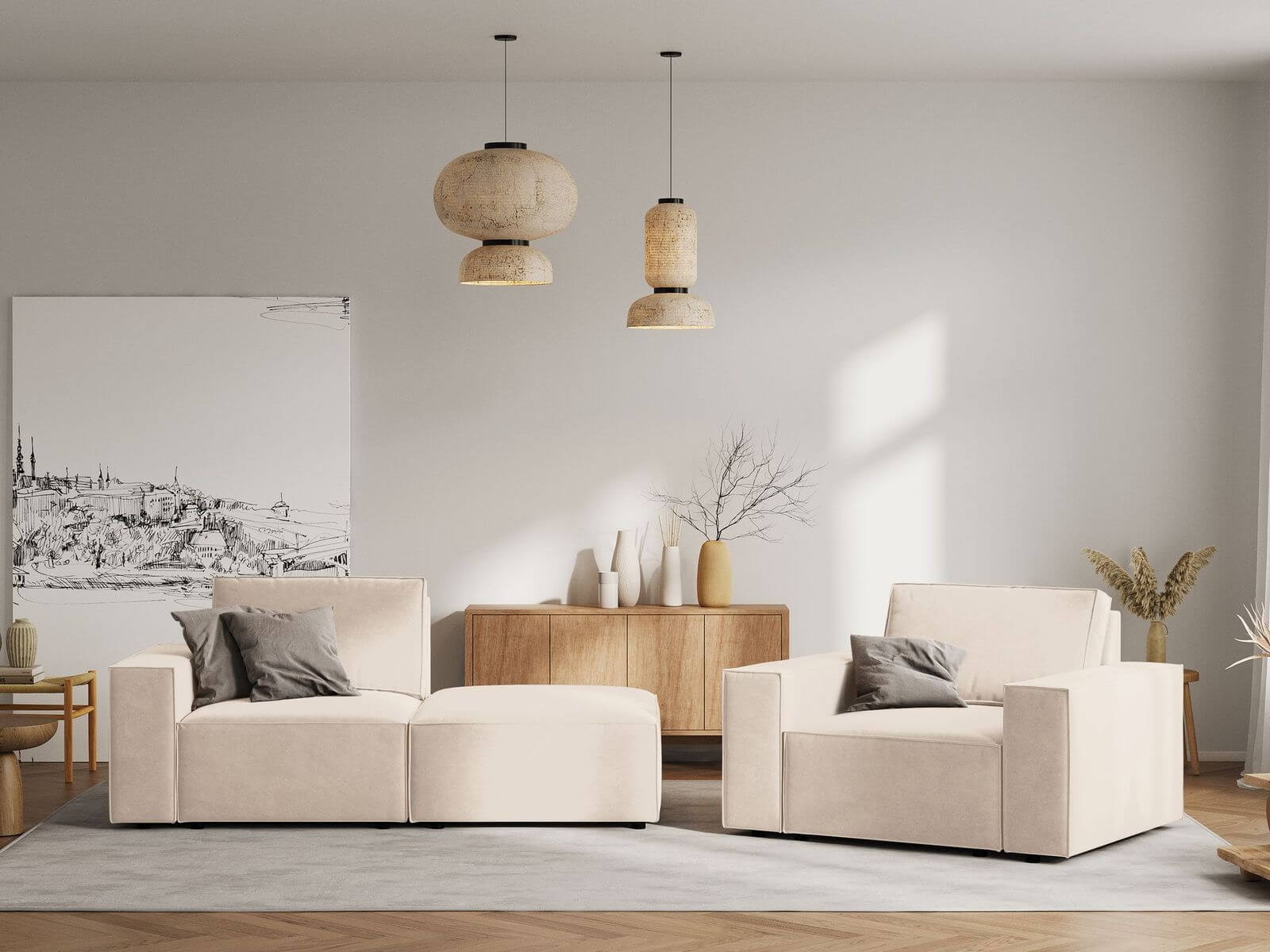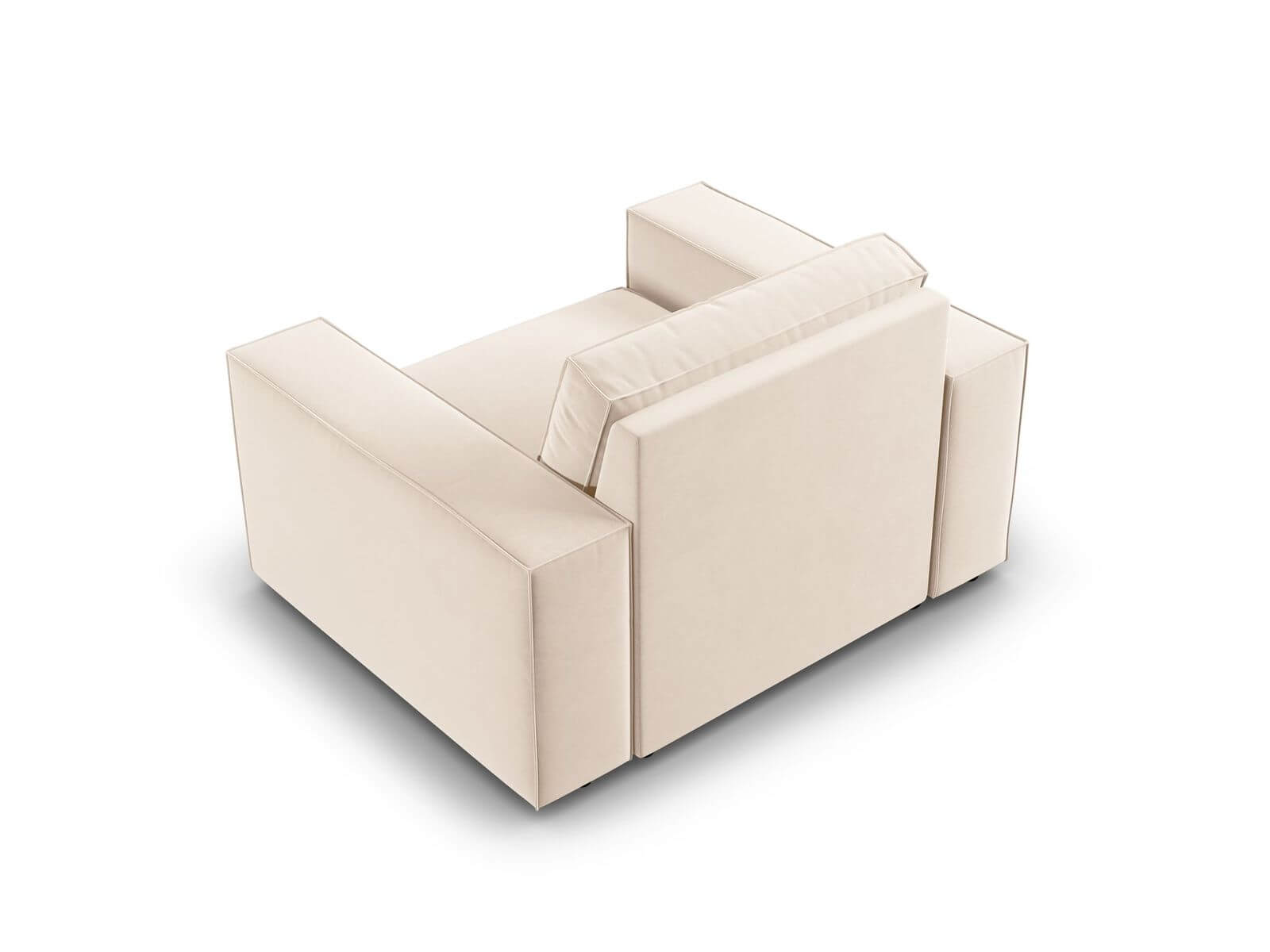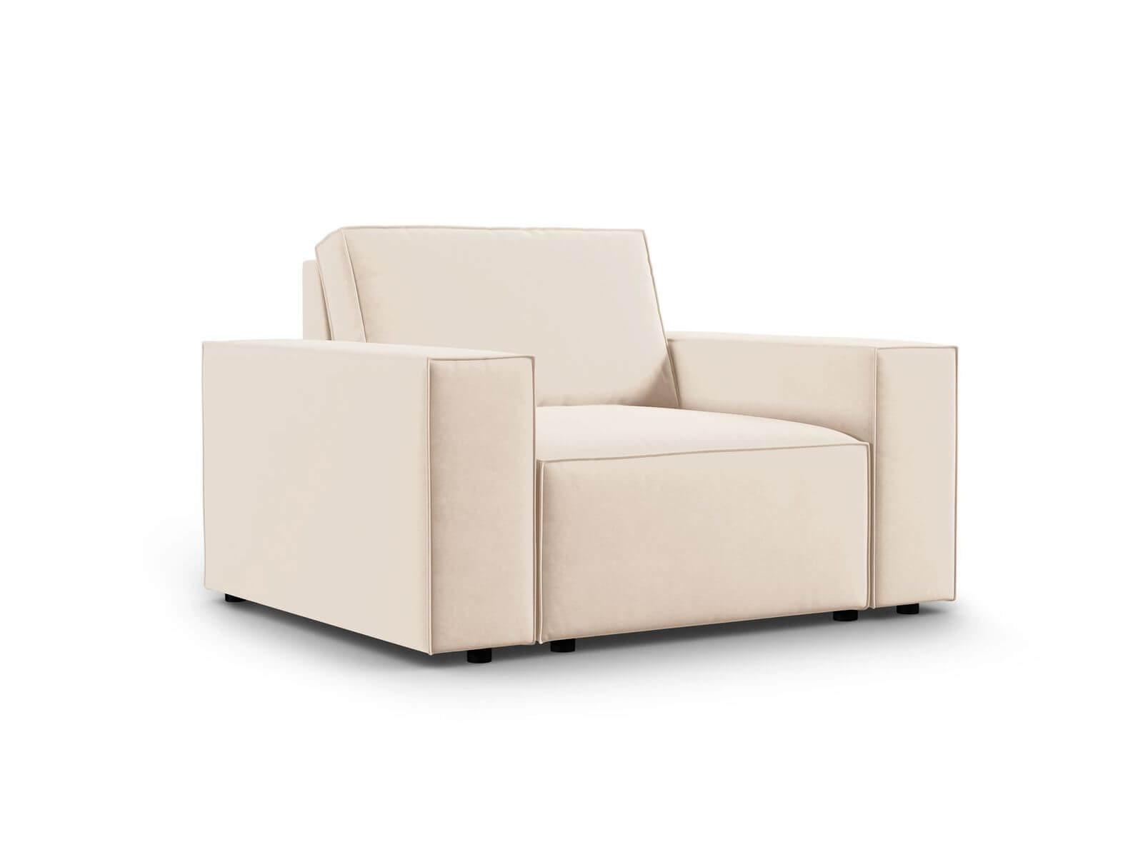 Beżowy, aksamitny fotel to trafny wybór do wnętrz w stylu minimalistycznym lub klasycznym.