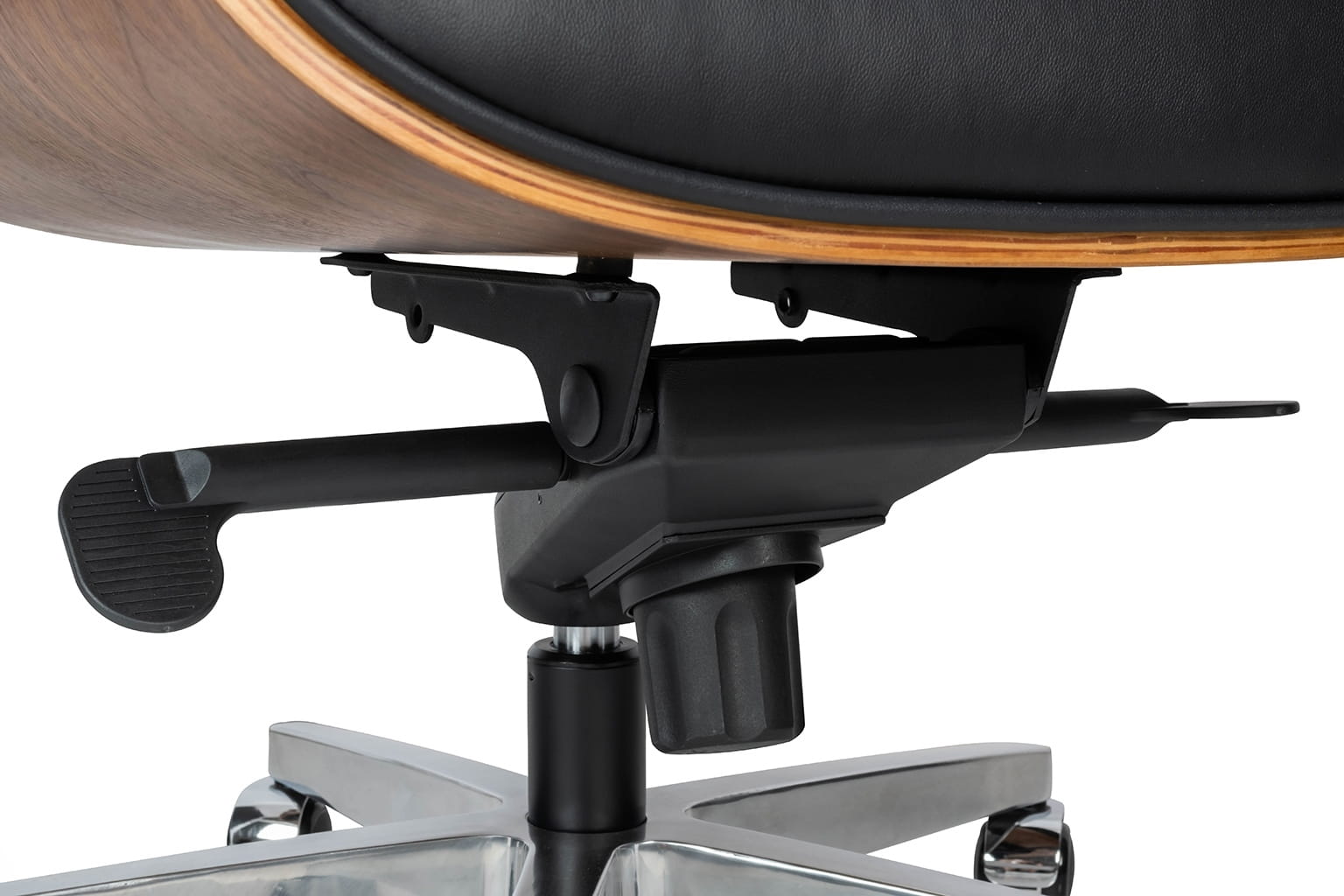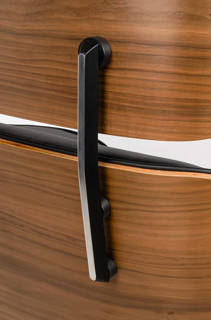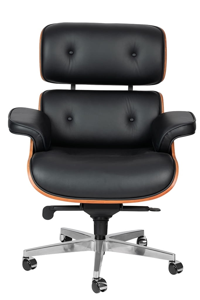 Całość fotela została tapicerowana wysokogatunkową naturalną skórą o klasycznym czarnym kolorze, której uniwersalna kolorystyka doda elegancji każdemu wnętrzu. Korpus fotela został wykonany z giętego na ciepło drewna w pięknym, orzechowym odcieniu. Fotel wyposażony został w regulację wysokości z funkcją bujania, umożliwiającą dopasowanie siedziska do indywidualnych preferencji użytkownika. Dodatkowo, regulacja oporu zapewnia jeszcze większą kontrolę nad położeniem fotela, aby zapewnić optymalne wsparcie dla pleców.