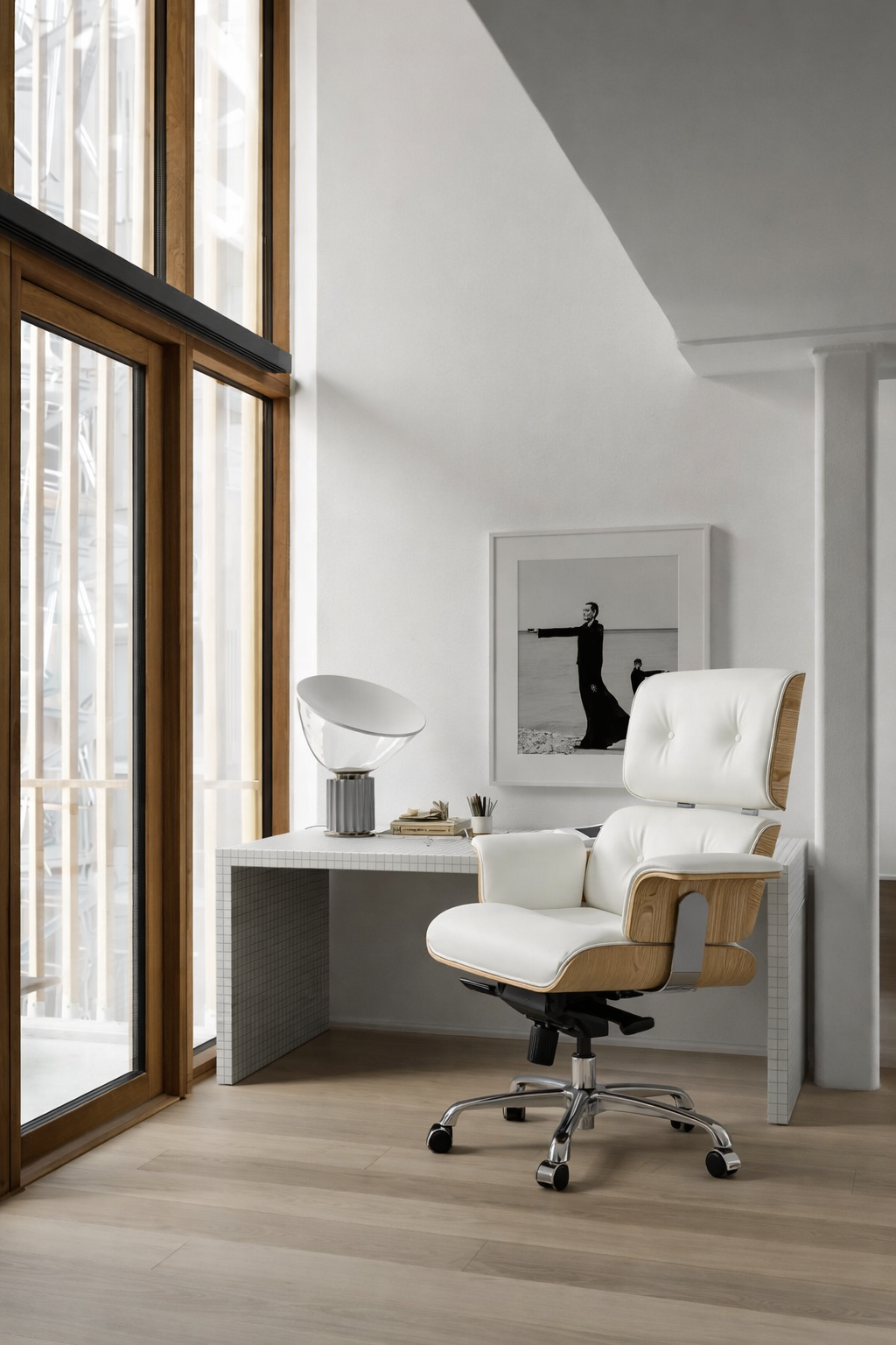 Elegancja, funkcjonalność i klasyczny design w jednym. Fotel Lounge Business w biurowej odsłonie to połączenie najwyższej jakości wykonania z kultowym stylem, który doskonale wkomponuje się w modne i prestiżowe wnętrza biurowe. Tapicerowany w całości wyselekcjonowaną włoską skórą naturalną, fotel dostępny jest w dwóch ponadczasowych kolorach: białym i czarnym. Korpus wykonano z giętego na ciepło drewna w kolorze jesionu, co nadaje mu wyjątkowej trwałości i estetyki.