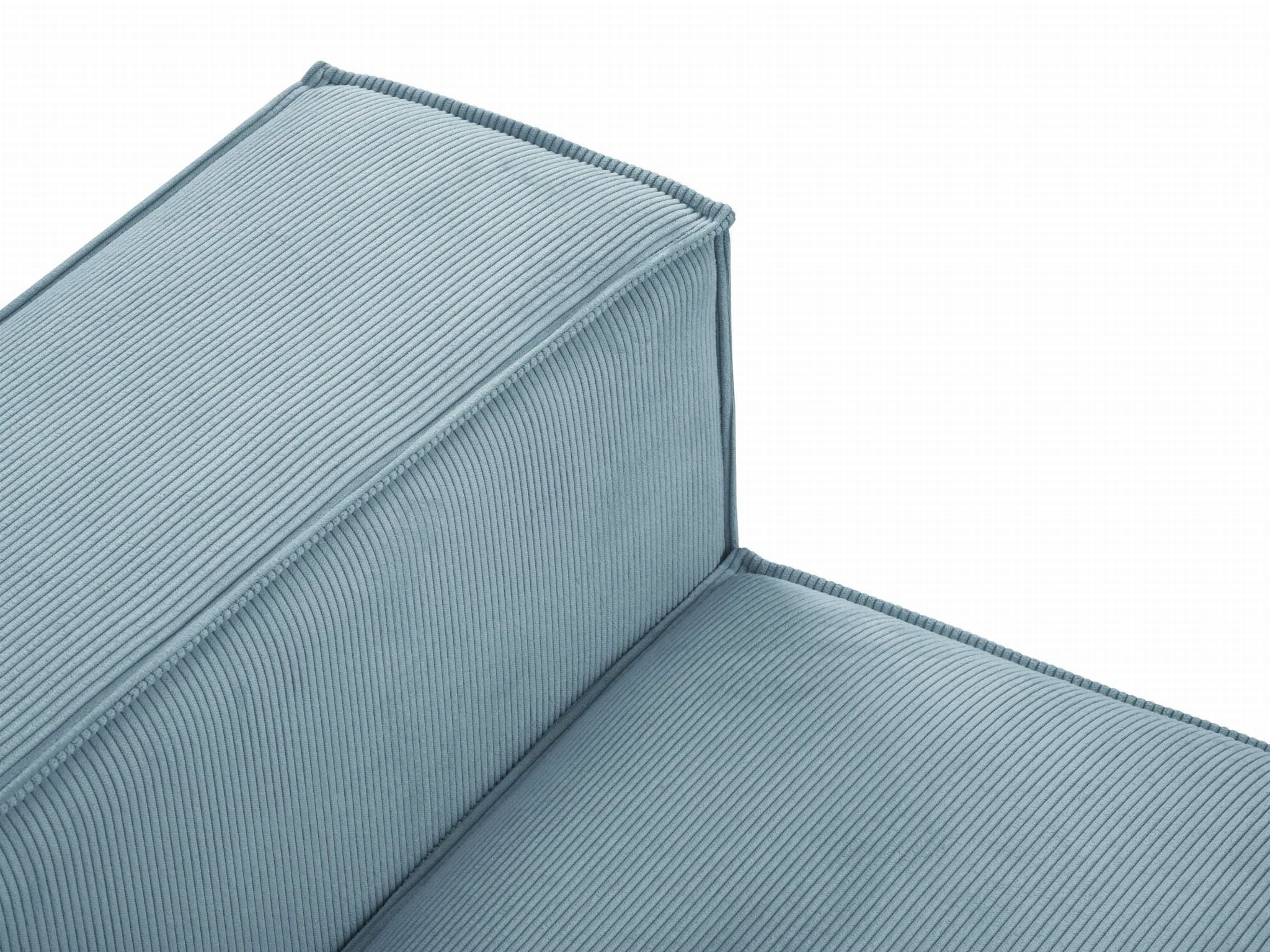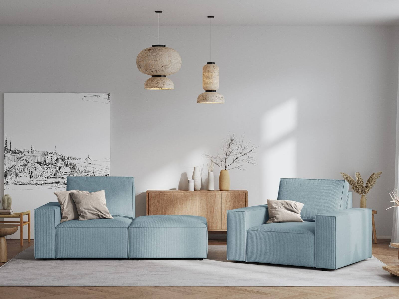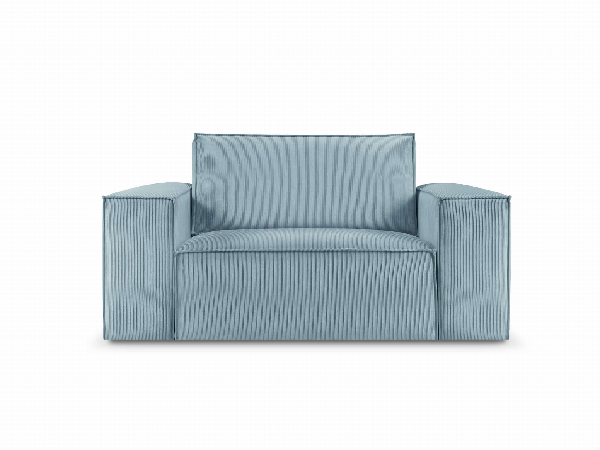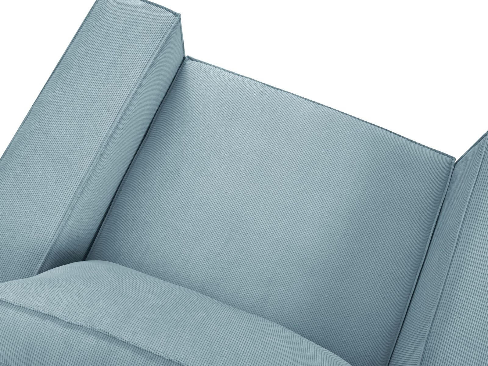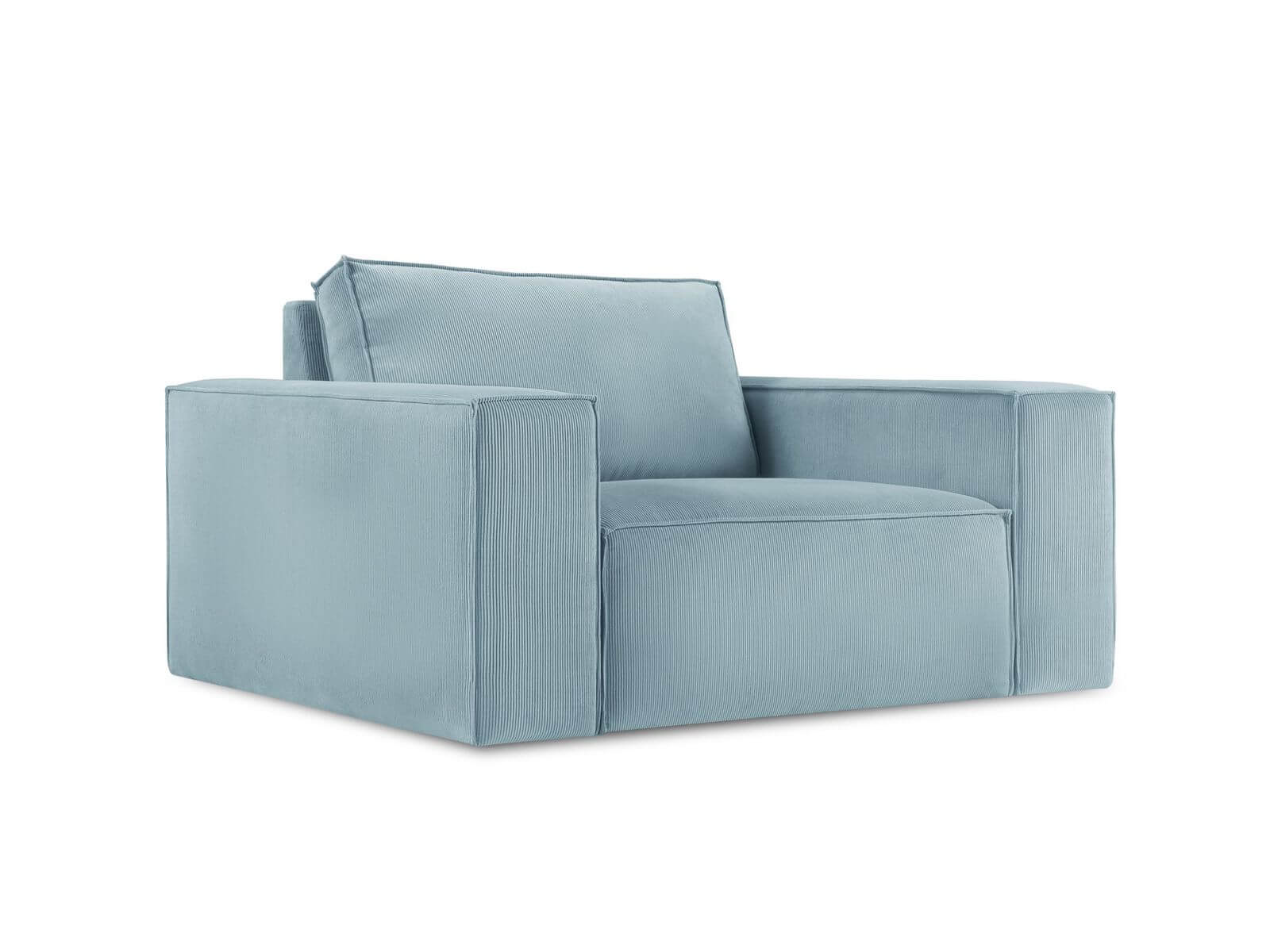 Jasno niebieski fotel Carlo to mebel cechujący się geometryczną bryłą i jednocześnie wysokim komfortem wypoczynku. Wyróżnikiem minimalistycznego fotela do salonu jest jego tapicerka - mebel obity jest tkaniną imitującą sztruks. To nowoczesne rozwiązanie podbija walory estetyczne fotela, którego designerska forma wykończona jest wyjątkową fakturą materiału.