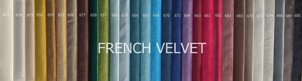 Pokrycie aksamitną tkaniną welurową, w dowolnym kolorze wybranym z wzornika załączonego w galerii produktu. Nóżki to drewno lakierowane w kolorze czarnym.
