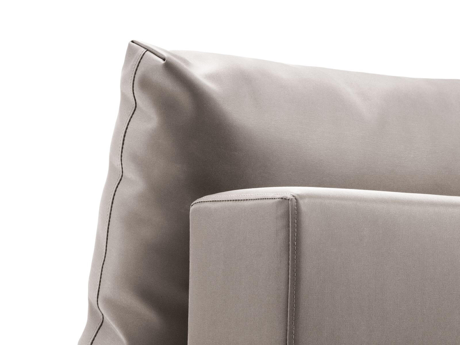 Modułowy fotel ogrodowy obity jest beżową tkaniną Vinylpex (kolor W08), która posiada powłokę hydrofobową, zapobiegającą wchłanianiu płynów. Ponadto materiał jest niezwykle odporny na ścieranie (test Martindale 102500, 695 g/m², skład powłoki: 95% PVC, 5% PU). Tkanina posiada powłokę antybakteryjną.