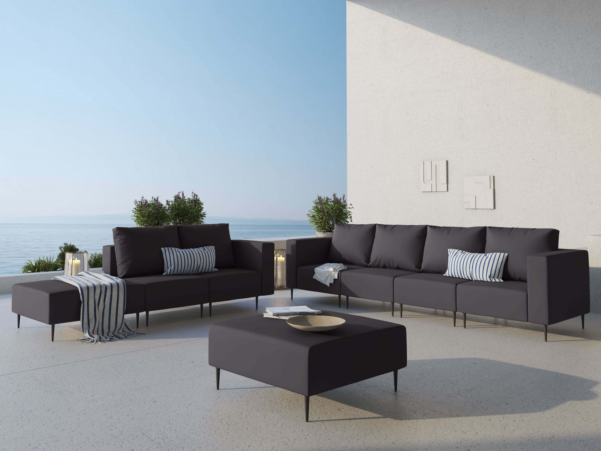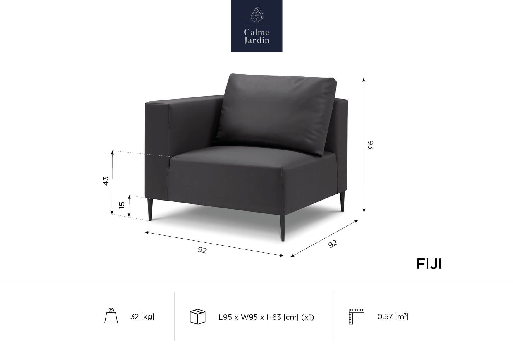 Nowoczesny fotel modułowy do ogrodu, który jest świetnym uzupełnieniem do pozostałych mebli z kolekcji Fiji. Pokryty ciemną, odporną na warunki zewnętrzne, tkaniną. Do wyboru w wersji lewo lub prawostronnej.