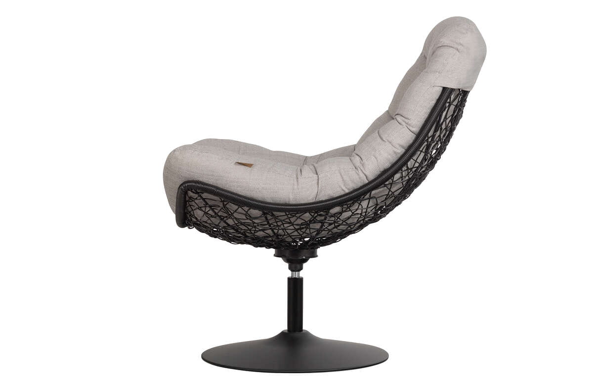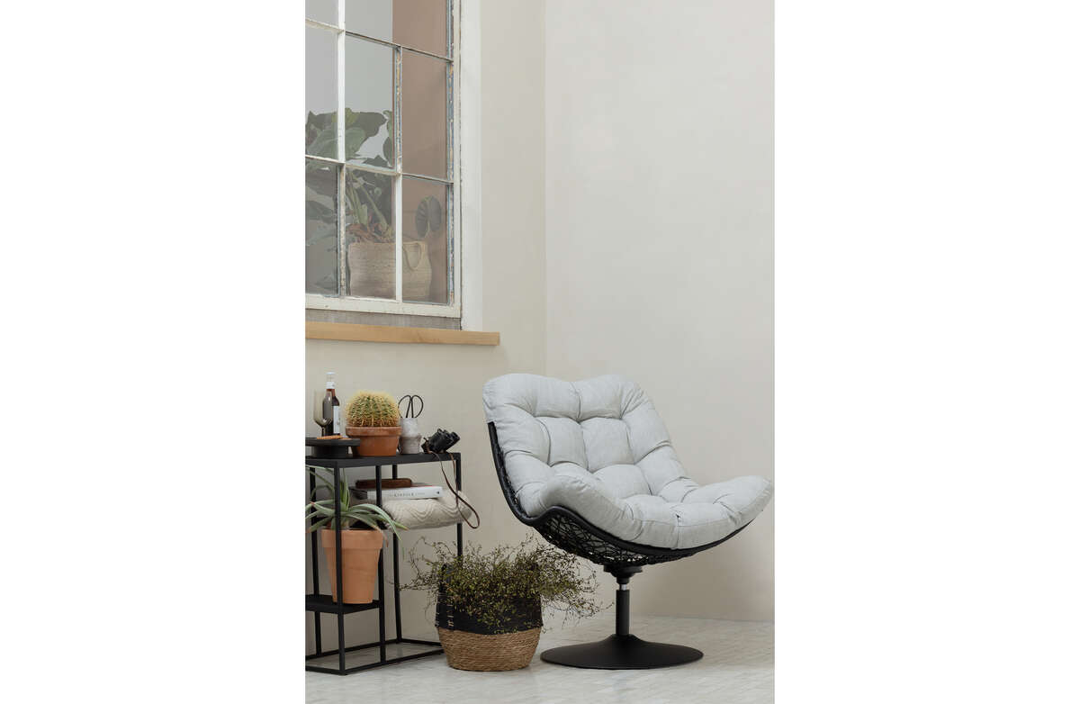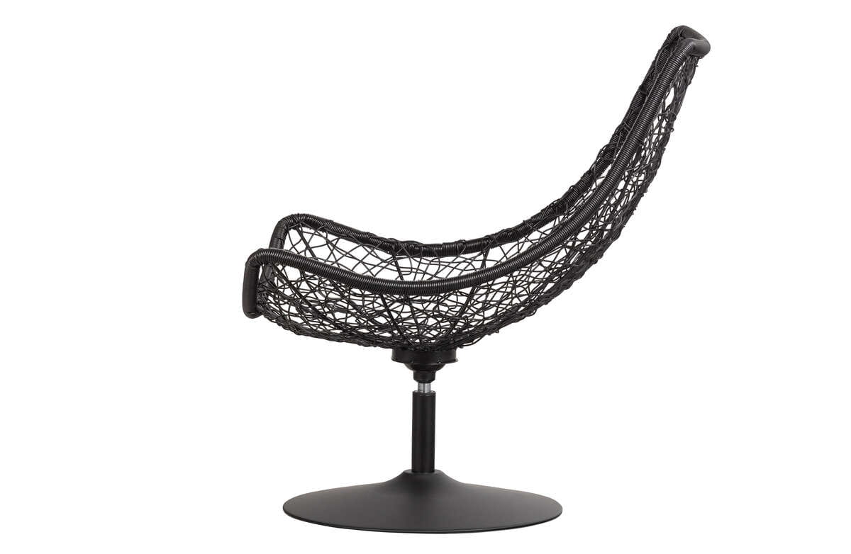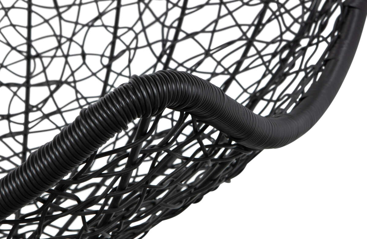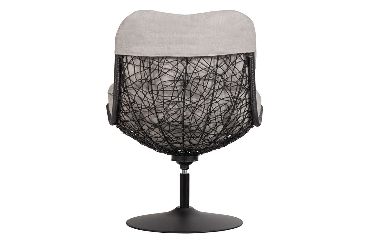Siedzisko wykonano w 100% z poliestru, który imituje naturalny rattan i jest jego plastikową wersją. Całość osadzona została na solidnej, matowo wykończonej podstawie z funkcją obrotową. Plastikowy rattan użyty do produkcji fotela jest niezwykle wytrzymałym materiałem o wysokiej elastyczności, co zapewnia długą żywotność produktu. Ma on takie same cechy, jak ratan naturalny czyli charakterystyczne nierówności i zgrubienia na powierzchni. Na korpusie osadzona jest beżowa, pikowana poduszka, którą w dowolnej chwili można zdejmować.