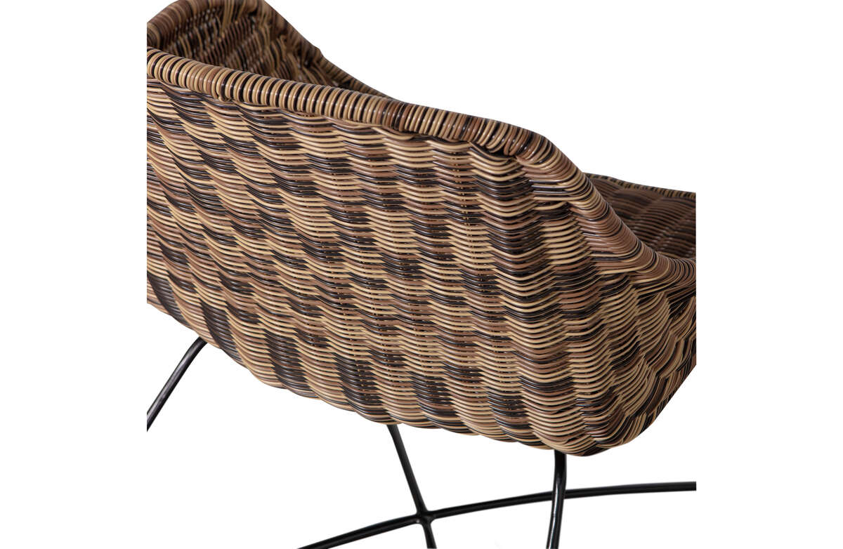 Fotel Frankie wyróżnia się obszernym siedziskiem i miękką, zaokrągloną linią, które wspólnie tworzą kubełkową formę idealną do relaksu. Materiały najwyższej jakości - rattan syntetyczny i metal - sprawiają, że nasz fotel nie tylko prezentuje się stylowo, ale także jest wyjątkowo trwały. Wykorzystanie sztucznego rattanu w siedzisku nadaje mu nie tylko pożądanego boho wyglądu ale również czyni go odpowiednim zarówno do użytku wewnątrz pomieszczeń, jak i na zewnątrz.
