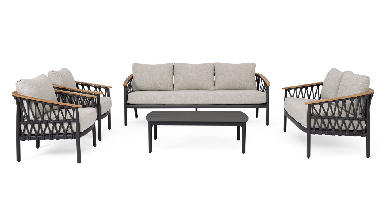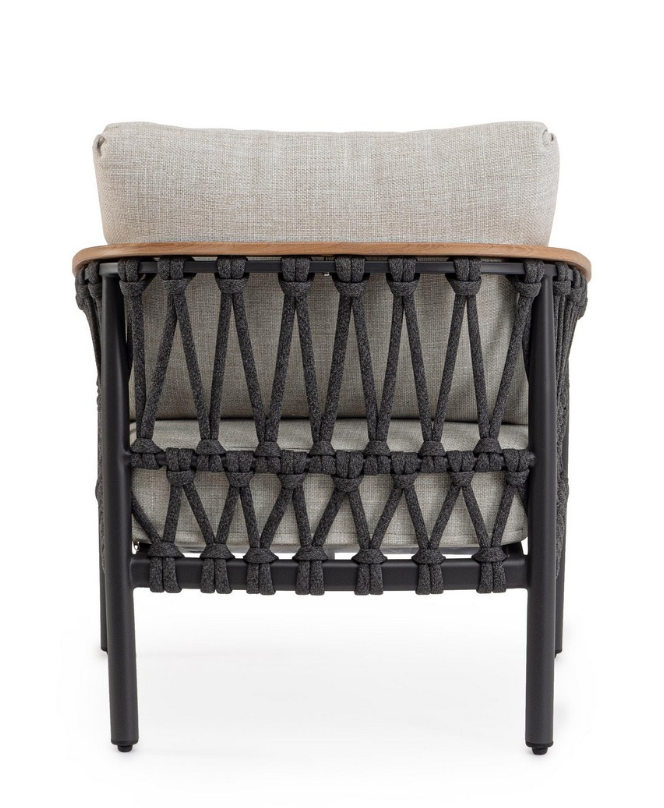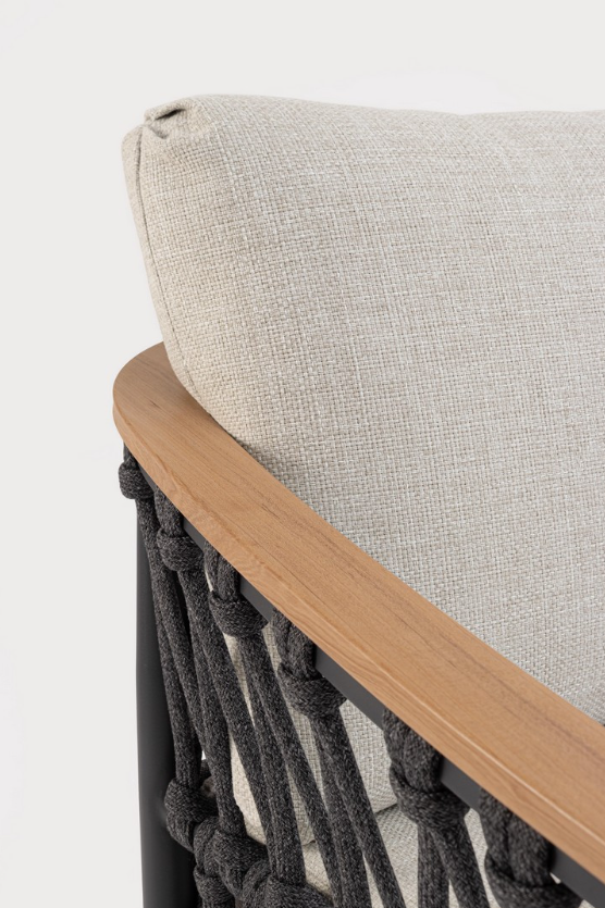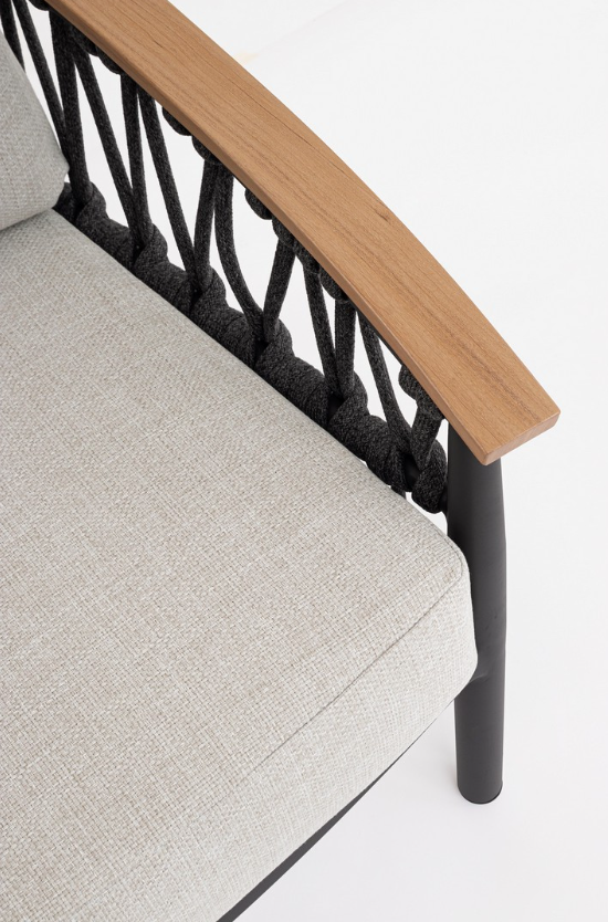 Projekt przyciąga wzrok unikalnym wykończeniem tyłu i boków, które zdobi gęsta, geometryczna plecionka z liny syntetycznej Olefin. Ten ażurowy detal nadaje bryle rzemieślniczego charakteru i sprawia, że fotel prezentuje się zjawiskowo z każdej perspektywy. O Twój wypoczynek dbają grube, miękkie poduszki siedziskowe i oparciowe, obszyte zaawansowaną, wodoodporną tkaniną Olefin. Materiał ten doskonale znosi wilgoć i jest wysoce odporny na promieniowanie UV, a dzięki ukrytym zamkom błyskawicznym pokrowce można łatwo zdjąć do prania.