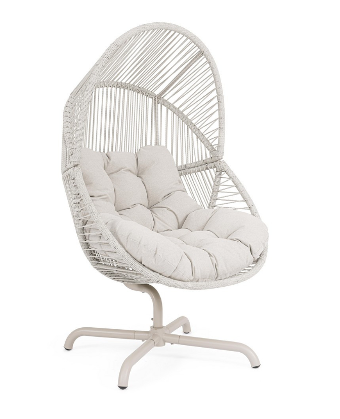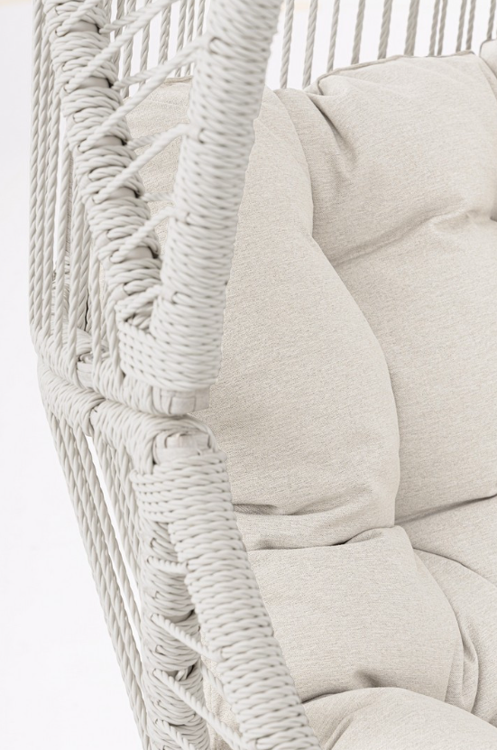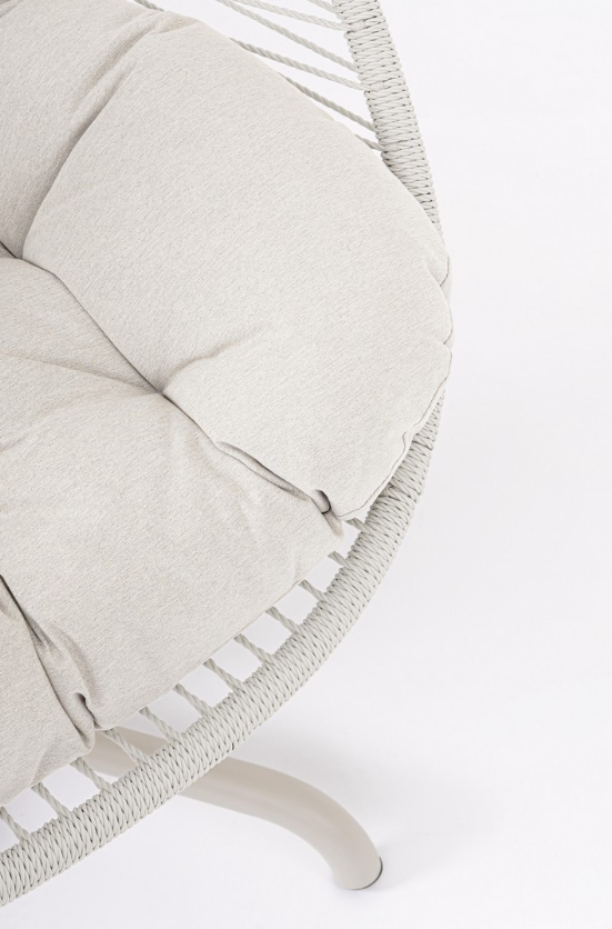 Stelaż wykonano ze stali poddanej procesowi fosfatowania oraz malowaniu proszkowemu, co zapewnia mu wysoką trwałość i odporność na korozję. Ażurowy korpus fotela zdobi misterna plecionka z okrągłego włókna syntetycznego (5 mm) w jasnym, piaskowym odcieniu, która nadaje całości rzemieślniczego charakteru. Wnętrze kokonu wypełnia potężna, pikowana poduszka wykonana z wodoodpornej tkaniny poliestrowej. Miękkie wypełnienie idealnie dopasowuje się do sylwetki, zapewniając wsparcie dla pleców i głowy.