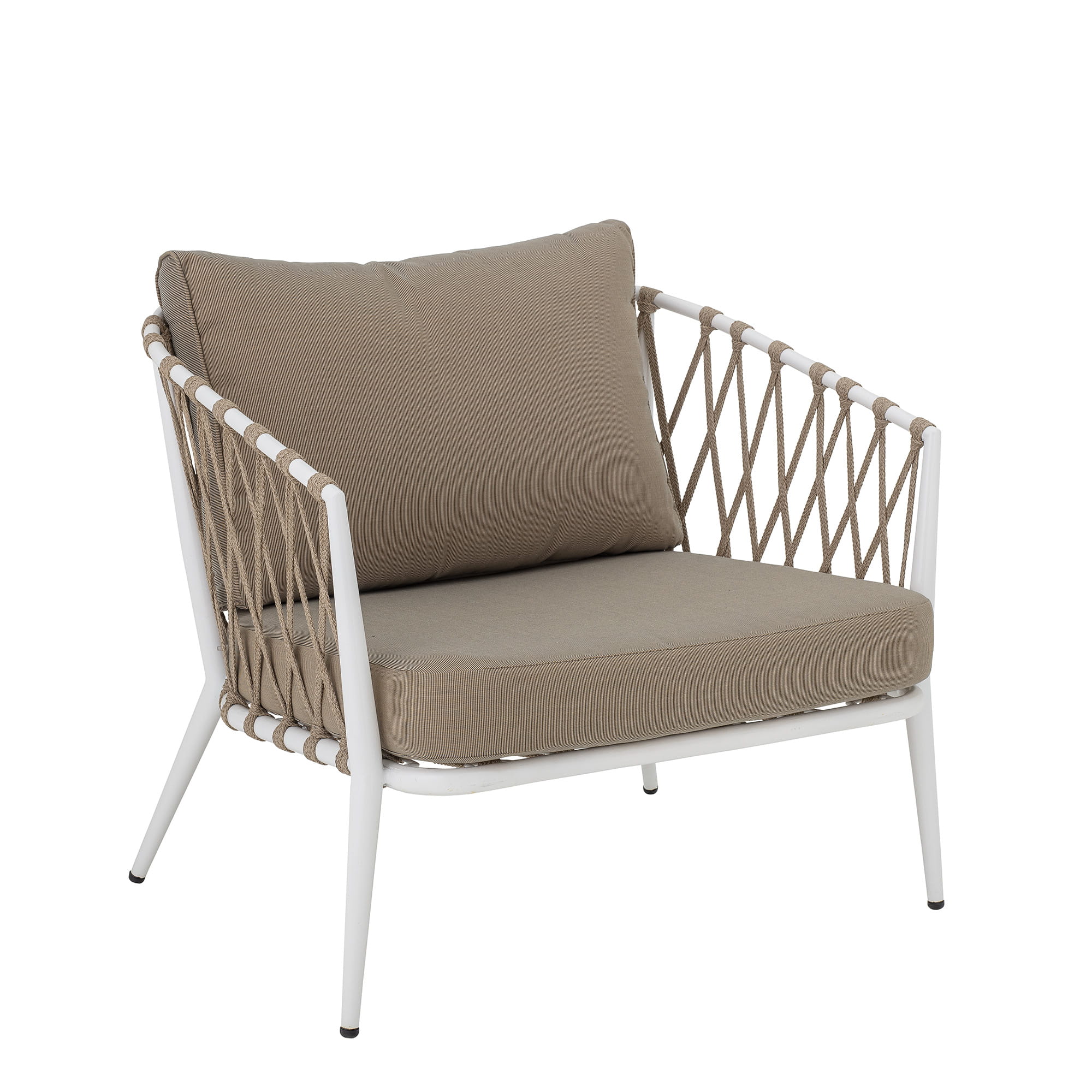 Krzesło wypoczynkowe Cia to elegancki mebel ogrodowy duńskiej marki Bloomingville, który wprowadza wyjątkową atmosferę do ogrodu lub na balkon, ale również do wnętrz takich jak salony czy jadalnie. Liny są pięknie utkane wokół białej żelaznej ramy, aby wspierać miękkie poduszki w modnym kolorze NUDE. Żelazna rama jest odporna na mróz, a liny są wodoodporne, więc poduszkę wystarczy zabrać tylko wtedy, gdy pada deszcz.