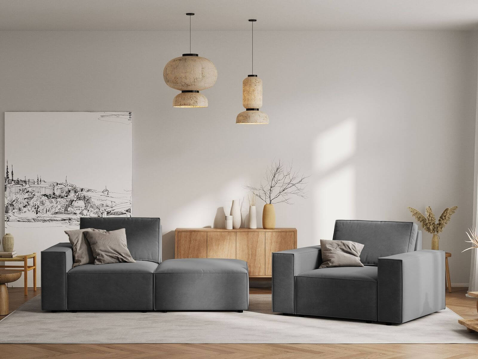 Szary, aksamitny fotel to trafny wybór do wnętrz w stylu minimalistycznym, nowoczesnym.