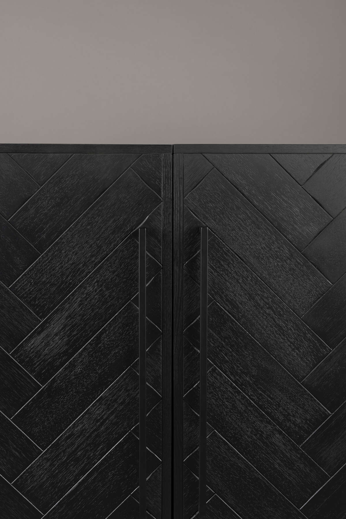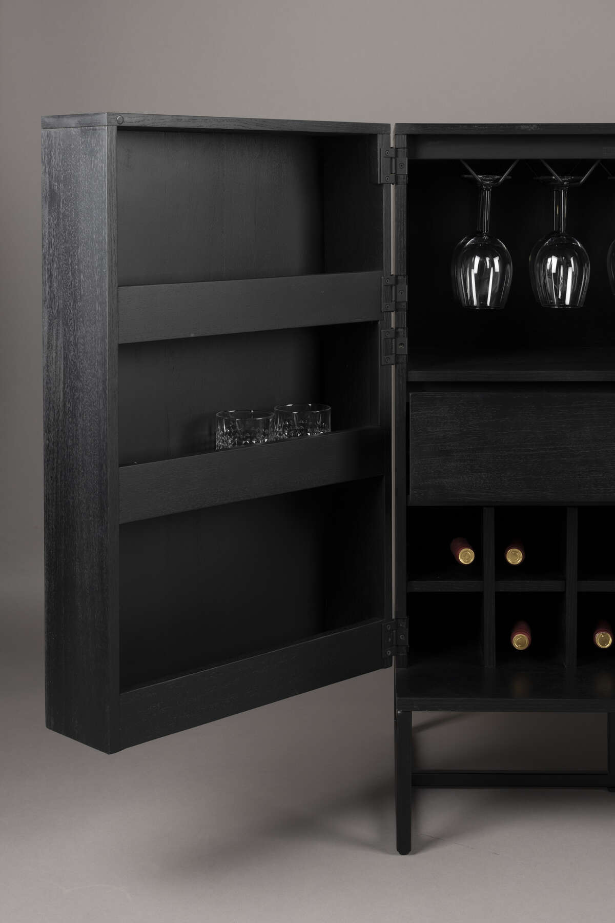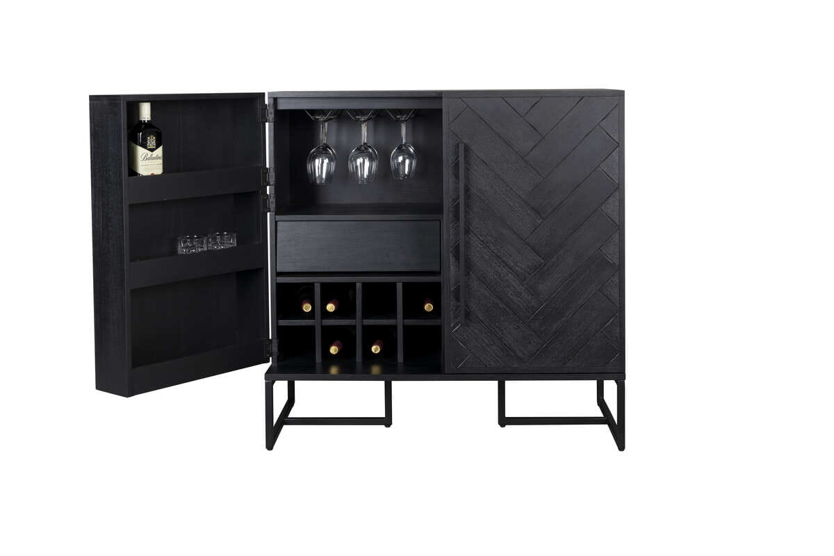 Czarny Gabinet Class - pojemny, stylowy i funkcjonalny mebel wnętrza. Idealny do pomieszczeń w stylu chińskim, vintage czy loftowym. Spełni się jako szafka i komoda barowa dzięki wyposażeniu bogatym w przegródki na butelki, uchwyty na kieliszki, czy też boczne pojemne miejsca o dowolnym przeznaczeniu. Gabinet wykończony wzorem w jodełkę, który nadaje mu ponadczasowości i niezwykłej elegancji. Design i szerokie zastosowanie mebla przypadnie do gustu nie tylko wielbicielom wina. Świetnie sprawdzi się w salonie, jadalni czy piwniczce.