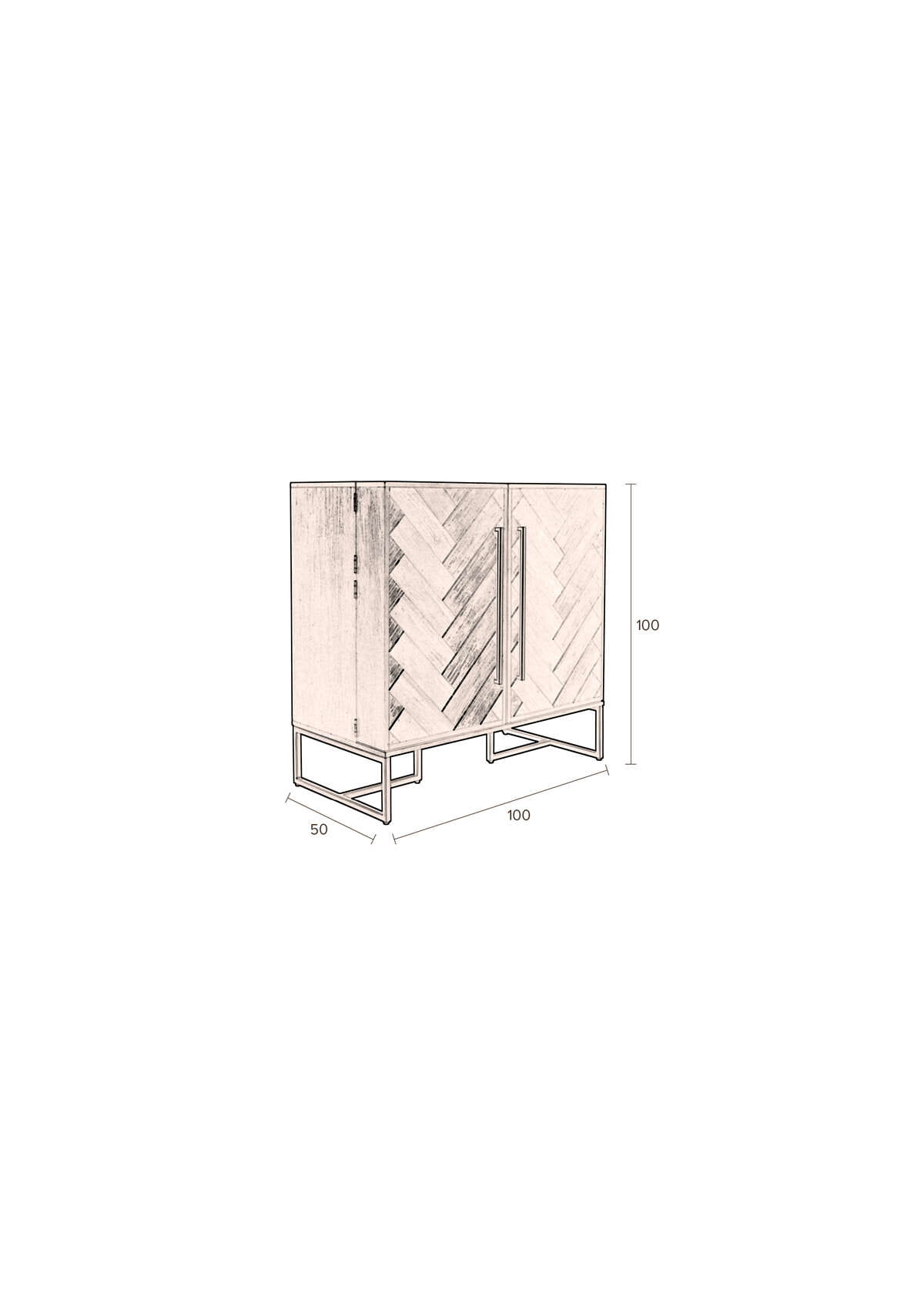 Gabinet wykonany z płyty MDF z okleiną dębową i pokryty dębową powłoką PU. Nogi i klamki drzwiczek wykonane ze wysokiej jakości stali, dzięki czemu zapewniają trwałość i stabilność. Plastikowe podkładki.