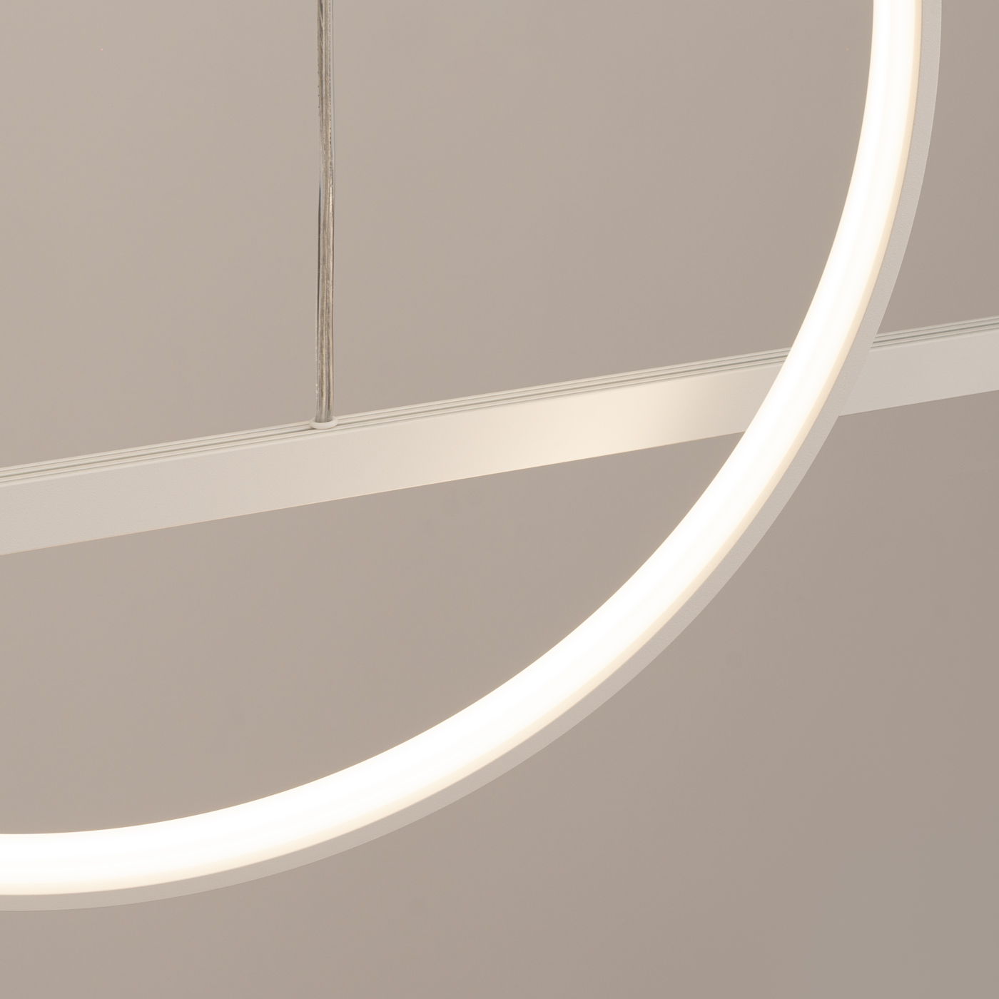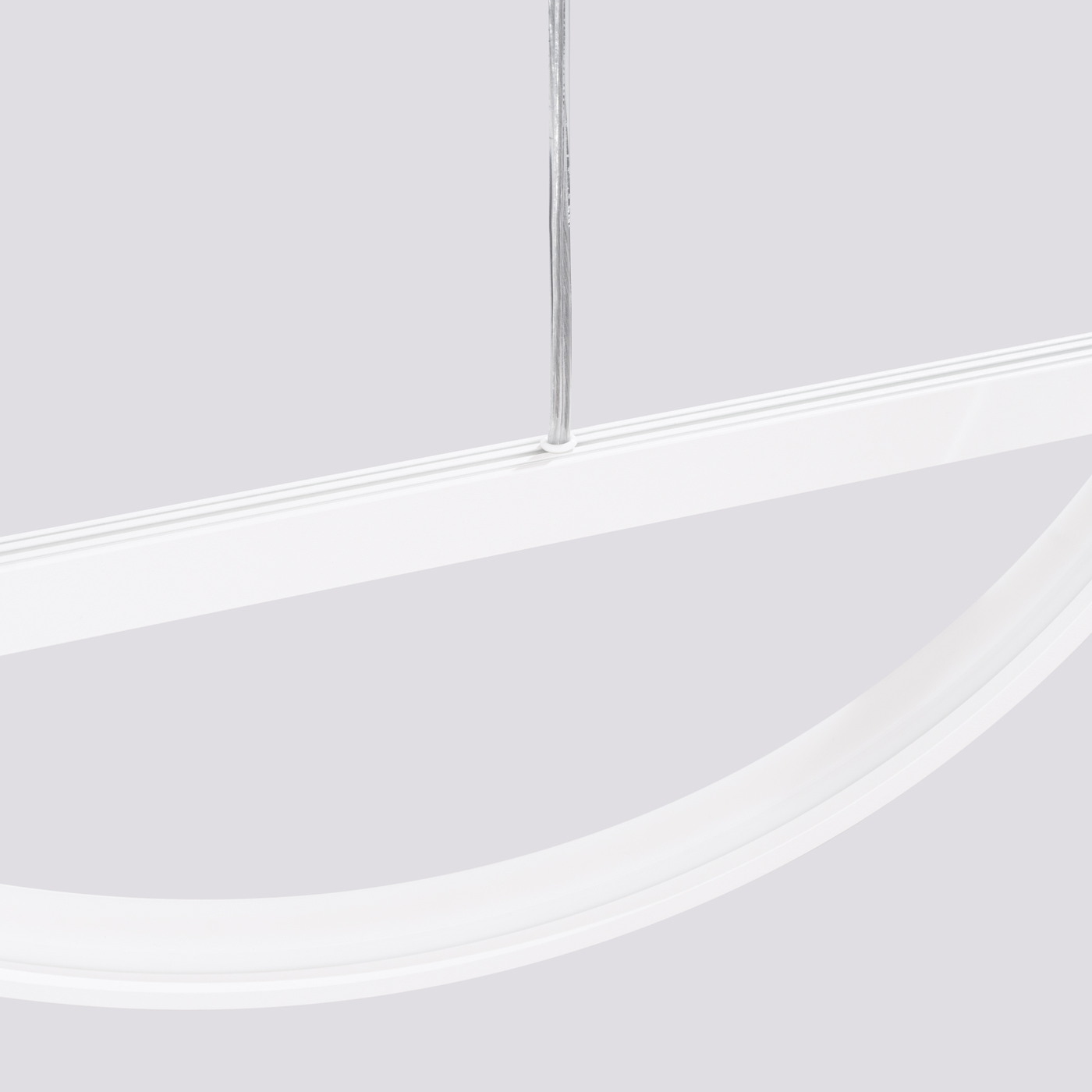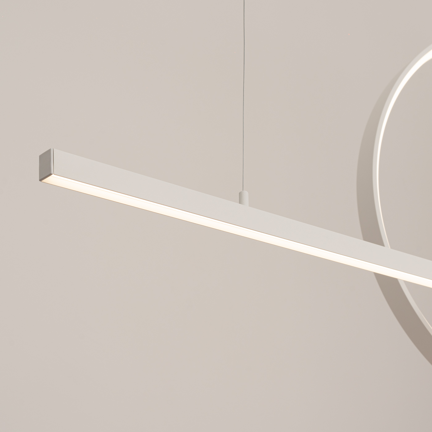 Dostępna w dwóch kolorach – białym i czarnym – lampa oferuje również możliwość wyboru barwy światła: ciepłej (3000K) lub neutralnej (4000K), co pozwala na dopasowanie jej do różnych stylów aranżacyjnych. Proste linie belki kontrastują z łagodną formą okręgu, co wprowadza dynamikę i ciekawą grę form, czyniąc lampę atrakcyjną wizualnie oraz estetycznie zbalansowaną.