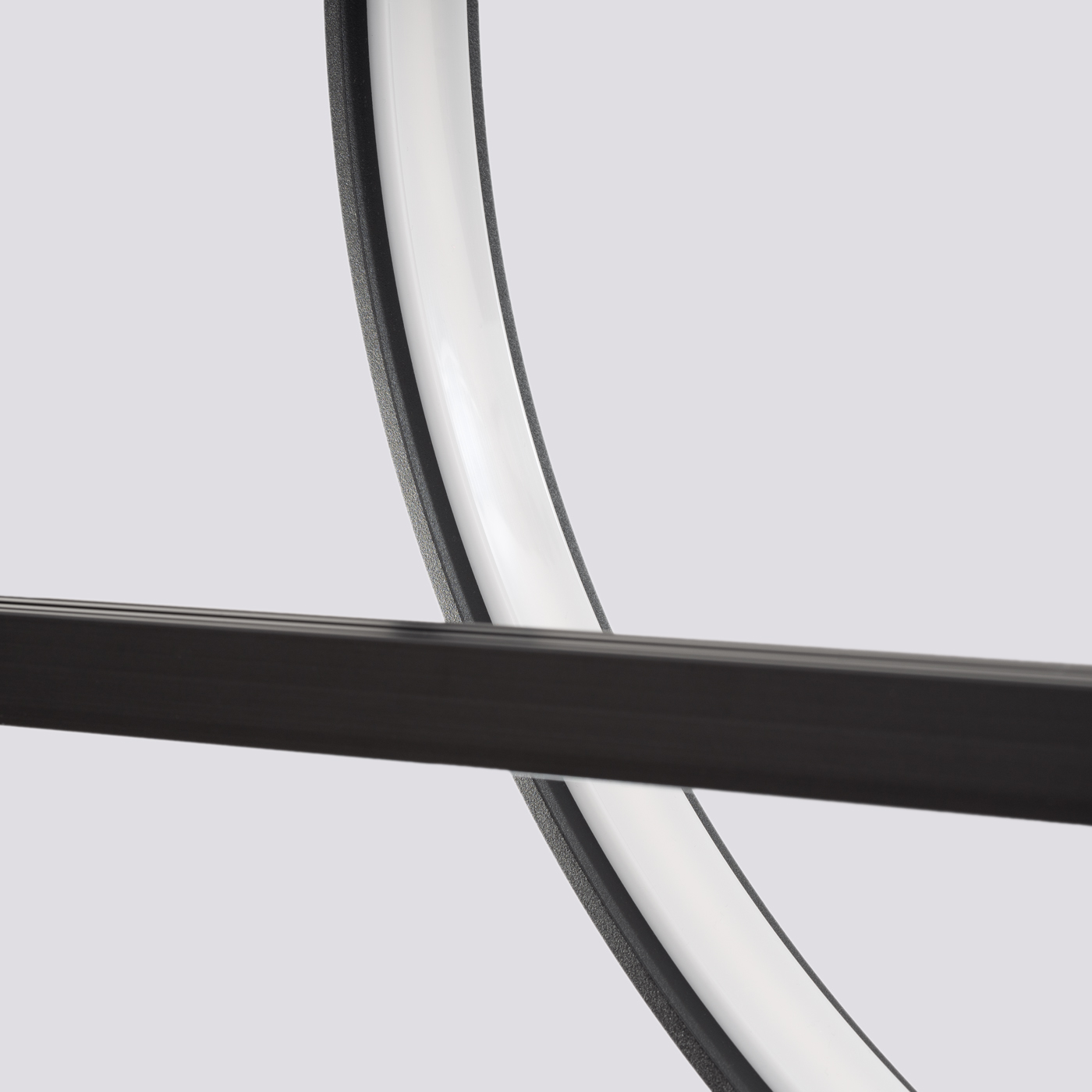 Dostępna w dwóch kolorach – białym i czarnym – lampa oferuje również możliwość wyboru barwy światła: ciepłej (3000K) lub neutralnej (4000K), co pozwala na dopasowanie jej do różnych stylów aranżacyjnych. Proste linie belki kontrastują z łagodną formą okręgu, co wprowadza dynamikę i ciekawą grę form, czyniąc lampę atrakcyjną wizualnie oraz estetycznie zbalansowaną.