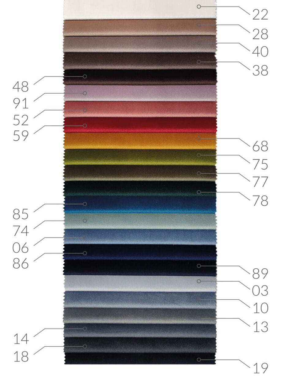 Prezentowane ciemno granatowe łóżko tapicerowane jest syntetyczną tkaniną imitującą aksamit - Bluvel 89. Delikatny połysk materiału sprawia, że jest on dobrym wyborem do eleganckich projektów wnętrz. Bluvel posiada bardzo dobrą odporność na ścieranie - Test Martindale'a 50000, 320 g/m². Tkanina jest miękka i jedwabista w dotyku. Pomyślnie przeszła test papierosowy, co oznacza, że jest odporna na tlenie i zapłon płomienia oraz spełnia normę PN-EN 1021-1:2014-12.