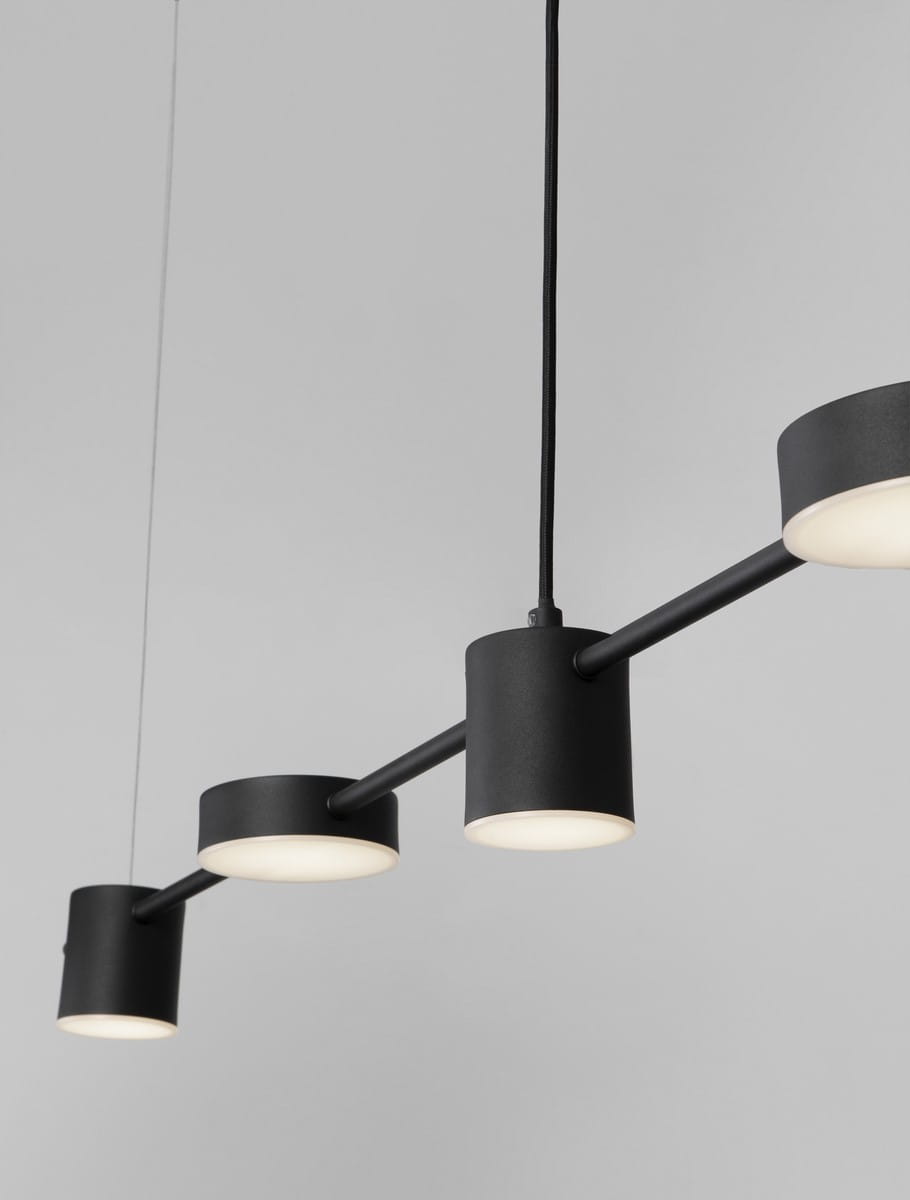 Industrialna lampa Abel Line to minimalistyczny design składający się z kombinacji geometrycznych kloszy, osadzonych naprzemiennie na prostej, metalowej rurze.