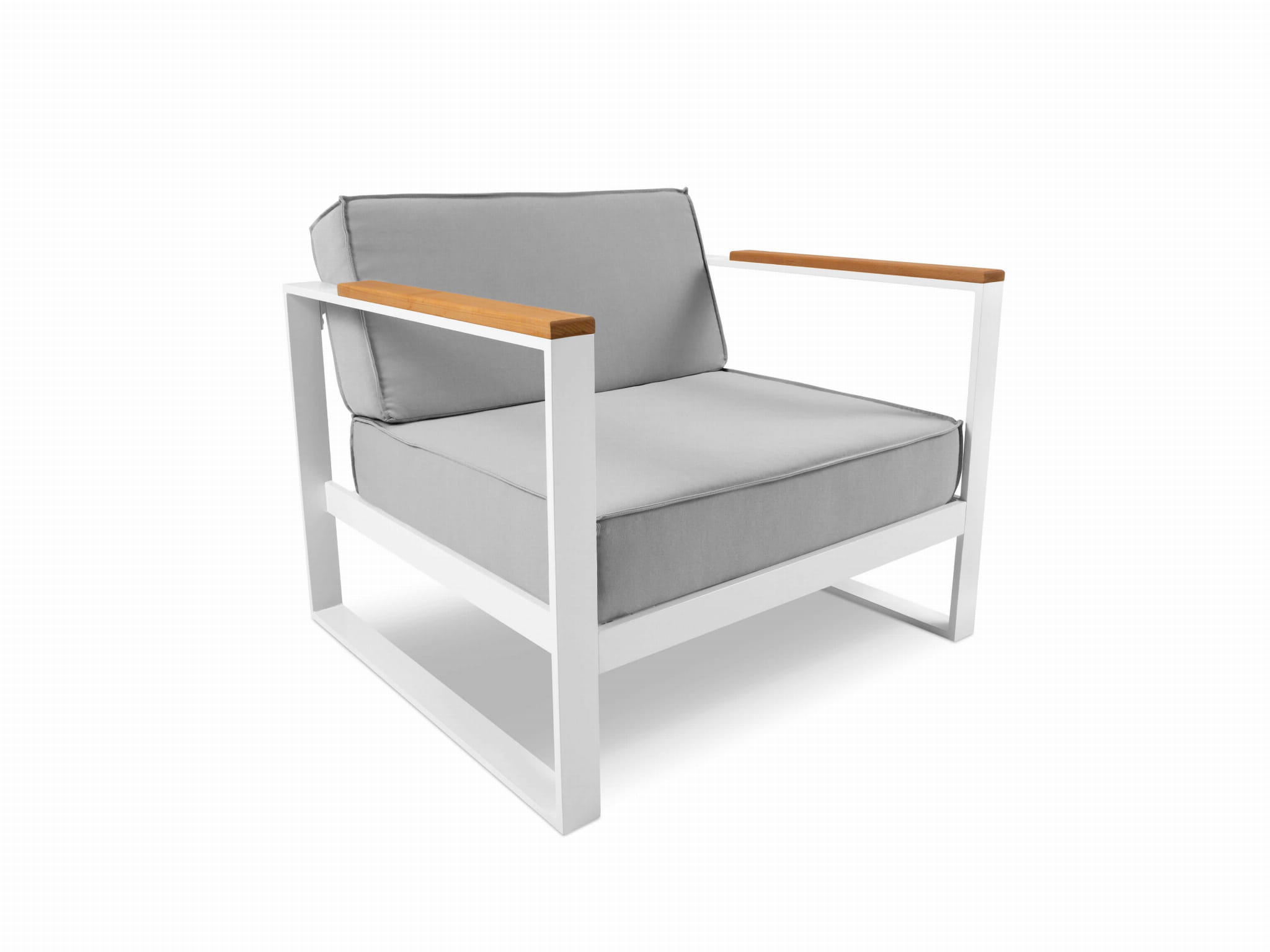 Jasno szary fotel ogrodowy w białej ramie stanowi harmonijną kompozycję kolorów, która przyciąga wzrok i dodaje estetyki do wypoczynkowej przestrzeni zewnętrznej.