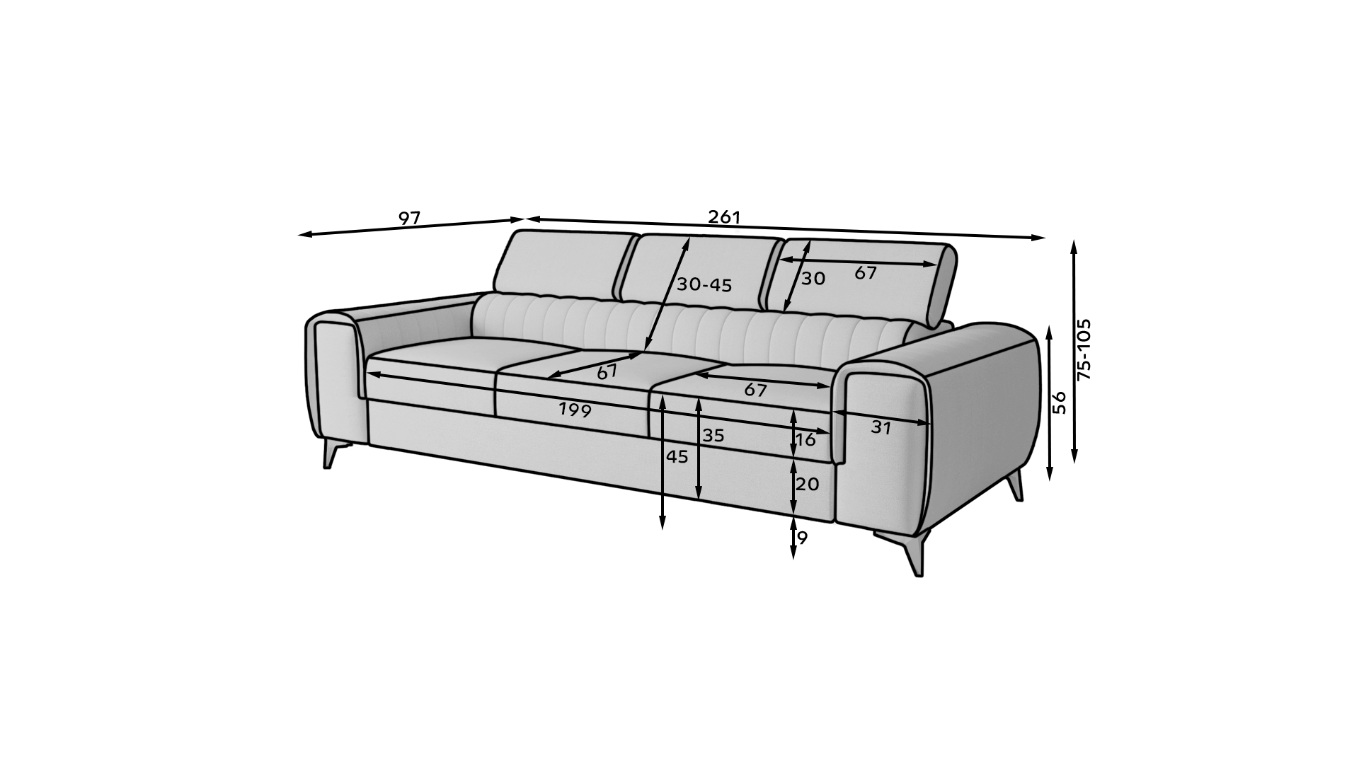 Kanapa posiada trzy regulowane zagłówki, które dopasujesz do swoich aktualnych potrzeb.