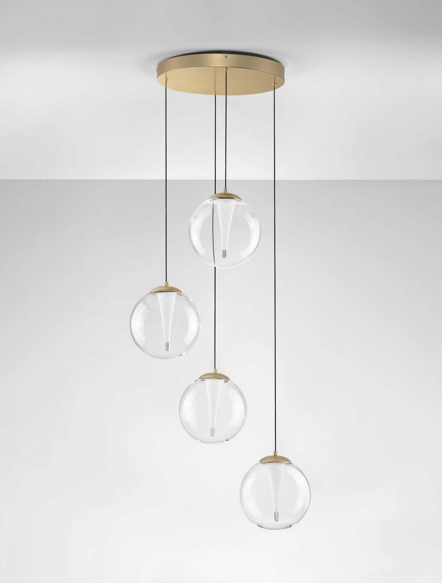 Lampa wisząca Hualmay Disc-4 to połączenie minimalistycznego designu i funkcjonalności, idealna do nowoczesnych wnętrz. Wykonana z wysokiej jakości metalu i szkła, cechuje się czystymi liniami oraz eleganckim wykończeniem w złotym kolorze. Jej konstrukcja składa się z czterech szklanych kloszy w formie idealnie przejrzystych kul, w których centralnie umieszczono wkłady LED o subtelnym, stożkowym kształcie.