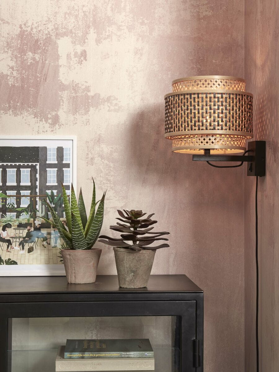 Abażur składa się z dwóch kloszy nałożonych na siebie, które wspólnie tworzą ciekawą formę. Zewnętrzny klosz został wykonany z połączenia naturalnej i czarnej plecionki bambusowej, układającej się w geometryczny wzór. Klosz osadzony został na ramieniu wykonanym z drewna bambusowego w czarnym kolorze. Całość przytwierdzona jest do ściany za pomocą czarnego elementu mocującego, z którego wychodzi tekstylny kabel z włącznikiem. Ażurowa plecionka klimatycznie rozprasza światło, wydobywając miękki, przytulny blask spod dwuwarstwowego klosza.