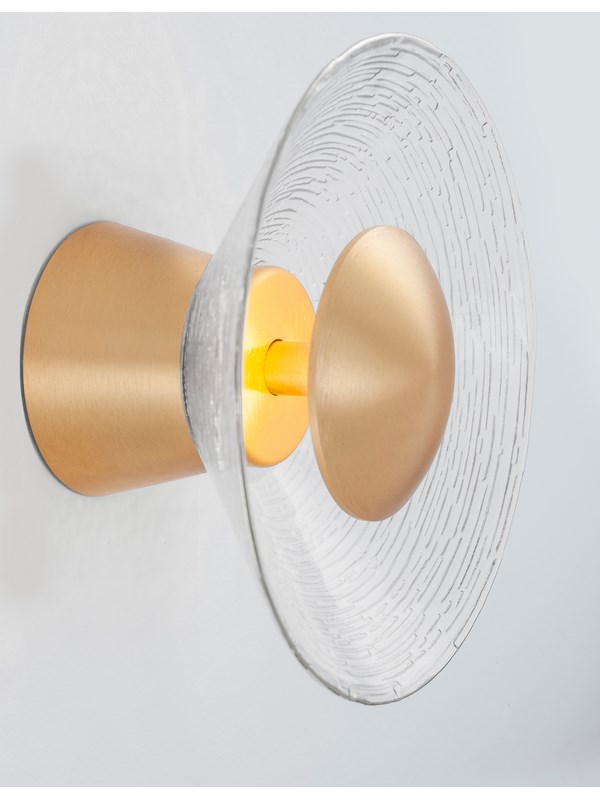Kinkiet Coro to propozycja dla osób ceniących elegancję i prostą, a jednocześnie efektowną formę. Wykonany z aluminium w złotym wykończeniu oraz transparentnego szkła o delikatnej, strukturalnej fakturze, tworzy wyjątkową grę światła i cienia, nadając wnętrzu niepowtarzalny charakter.