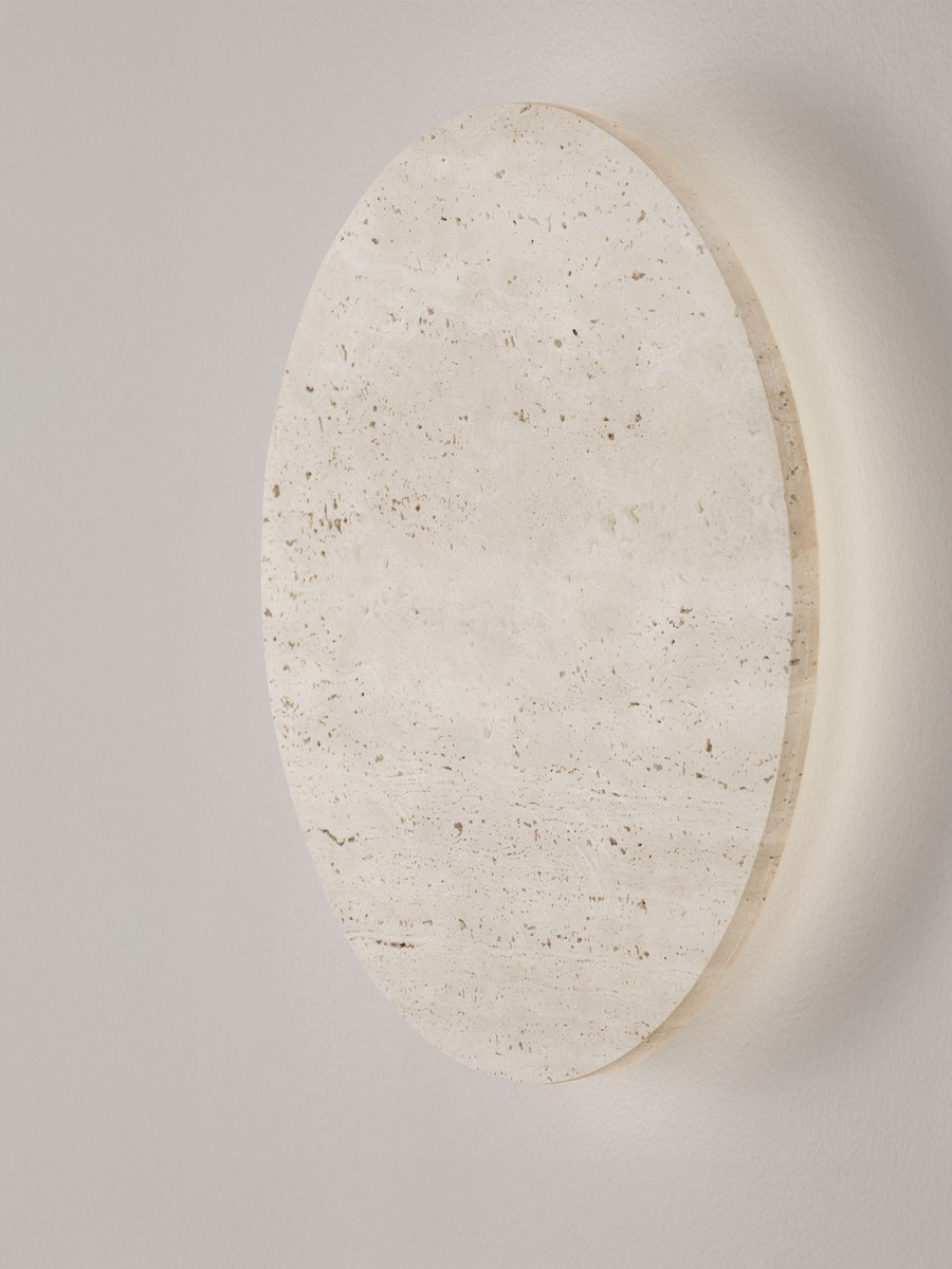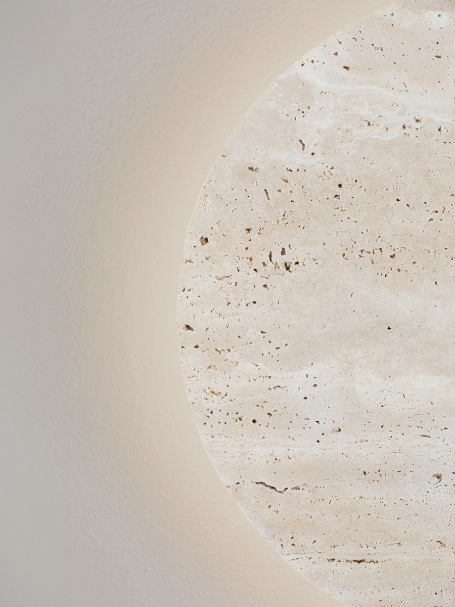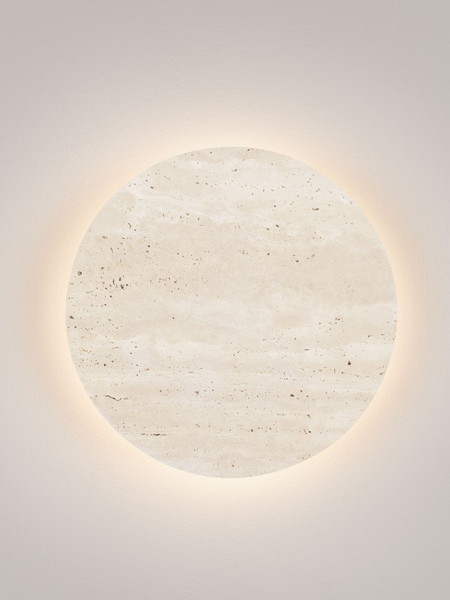 Projekt opiera się na koncepcji światła pośredniego. Zintegrowany moduł LED o mocy 14 W został ukryty za trawertynowym dyskiem, dzięki czemu strumień świetlny (869 lm) rozchodzi się promieniście na ścianę. Tworzy to miękką, dekoracyjną aureolę, która w efektowny sposób wydobywa nieregularne krawędzie kamienia i podkreśla jego organiczną fakturę. Taki rodzaj iluminacji buduje we wnętrzu atmosferę spokoju, luksusu i bliskości z naturą, nie powodując przy tym efektu olśnienia.