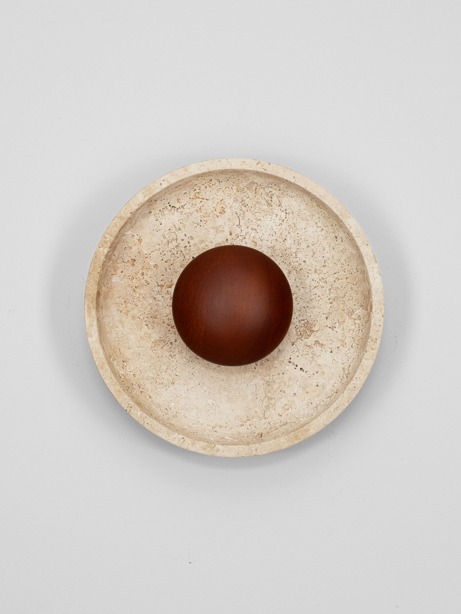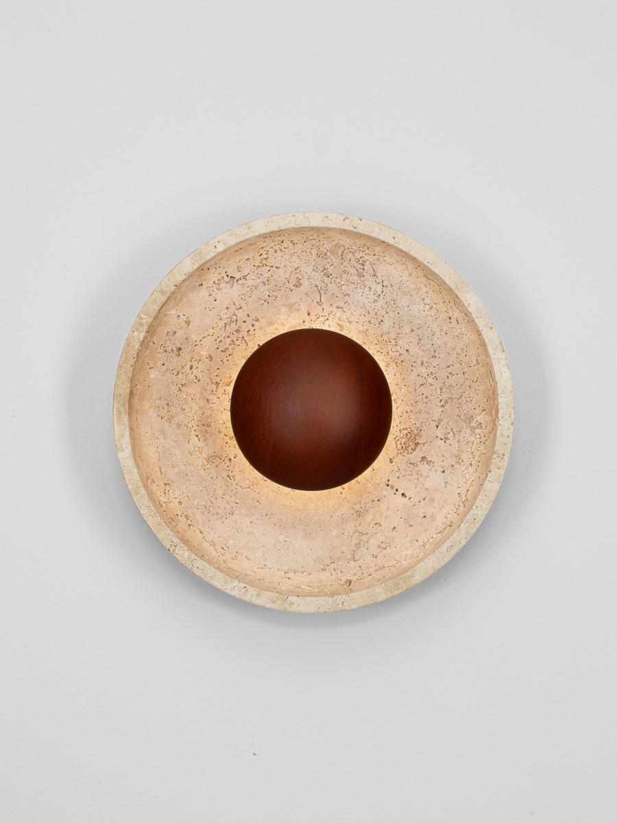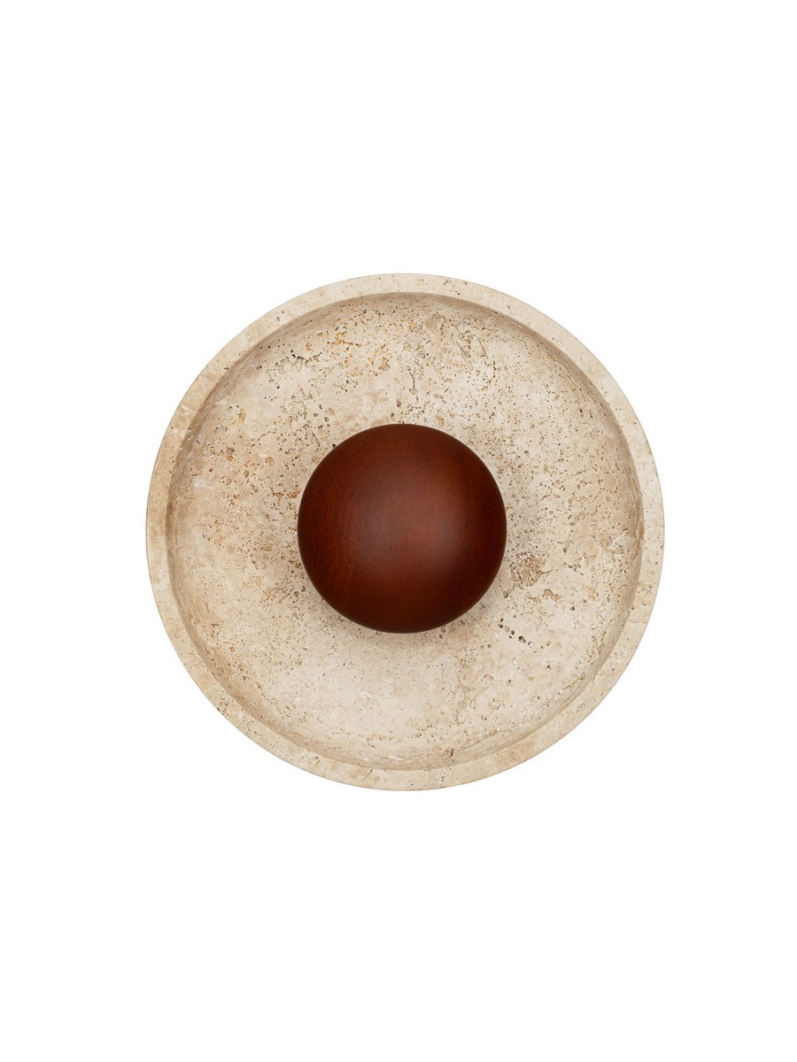 Kinkiet Motril o średnicy 25 cm od marki Nova Luce to unikalne oświetlenie, które doskonale łączy w sobie cechy sztuki użytkowej i przestrzennej rzeźby. Oprawa przybiera kształt kamiennej misy wykonanej z naturalnego trawertynu, w centrum której osadzono dekoracyjną, drewnianą kulę w odcieniu kawowego brązu. Porowata, niepowtarzalna dla każdego egzemplarza struktura kamienia sprawia, że lampa wprowadza do wnętrza autentyczny, surowy urok natury.
