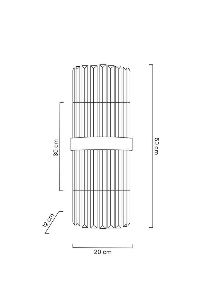 Kinkiet składa się z podłużnych, szklanych kloszy połączonych na środku za pomocą ozdobnej, srebrnej blaszki. Transparentne rurki dają efekt kryształu, subtelnie rozpraszając światło w górę i dół. Lampa do ściany przymocowana jest za pomocą obszernego, prostokątnego elementu mocującego, również w srebrnym kolorze.